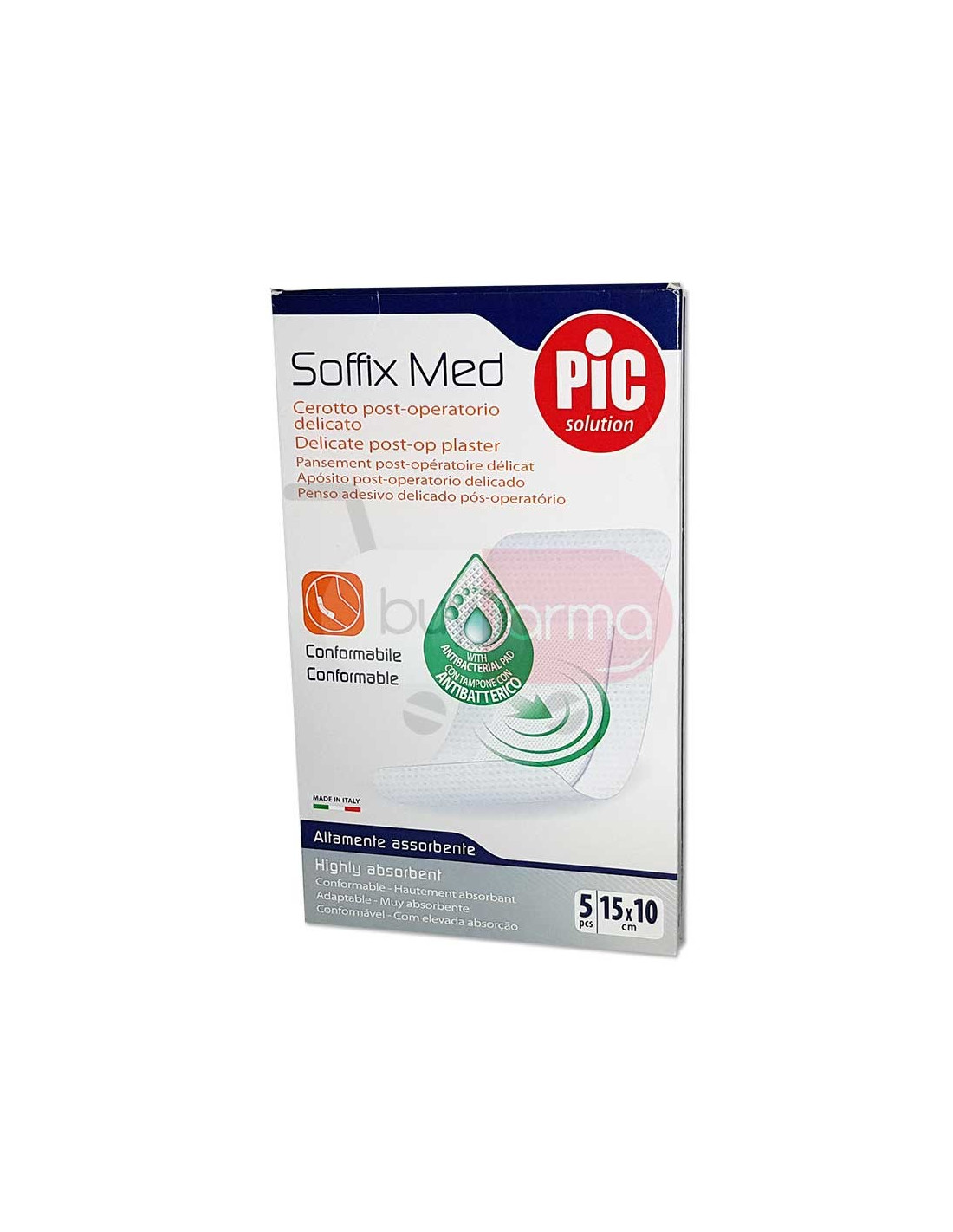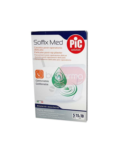 Caratteristiche Prodotto Pic Soffix Med contiene Clorexidina Digluconato, sostanza antibatterica ad elevato spettro d'azione che permette il controllo del microambiente del tampone garantendo la protezione della ferita dai rischi di infezione.Inoltre, la speciale retina antiaderente del tampone permette una rimozione indolore. Conformabile, traspirante e altamente assorbente.Formato: 5 Cerotti 15x10 cm