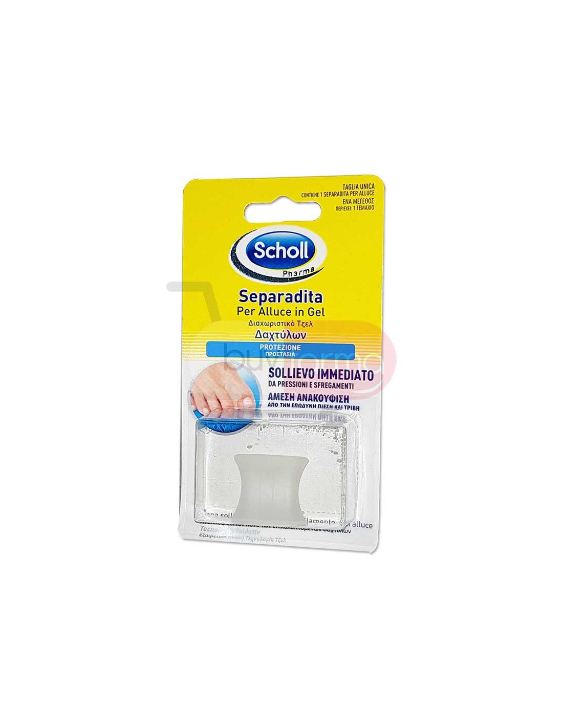 Scholl Separadita Per Alluce in Gel dona sollievo immediato da pressioni e sfregamenti. Tecnologia Gelactiv. (...)Caratteristiche ProdottoLa tecnologia Gelactiv dona sollievo immediato e protezione in caso di accavallamento dell'alluce.Quali sono i benefici ?- Riduce la frizione in caso di accavallamento delle dita- Morbido e adattabile per il massimo comfort- Trasparente e discreto- LavabileConsigli d'usoAssicurarsi che i piedi siano puliti e asciutti.Inserire il separadita tra le dita dei piedi.Rimuovere durante la notte.