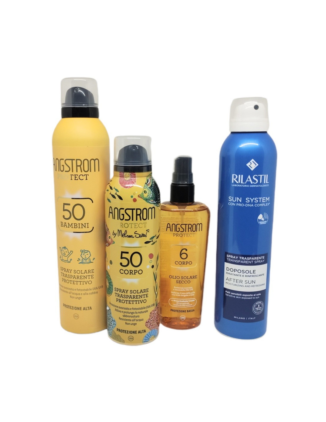 A cosa serve Angstrom Promo Pack Famiglia ? Il nostro Promo Pack è stato ideato per garantire protezione e sicurezza per ogni componente della vostra famiglia. All'interno del nostro bundle troverete i seguenti prodotti: Angstrom Protect - Spray Solare Trasparente SPF50 (formato edizione limitata) da 150ml; Angstrom Protect Bambini - Spray Solare Trasparente SPF50 da 250ml; Angstrom Protect - Olio Secco Solare in formato Spray da 150ml. Per le informazioni sui singoli prodotti visitare le relative schede. UN OMAGGIO PER TE! Con l'acquisto del Promo Pack Famiglia Angstrom riceverai in omaggio il Dopo Sole Rilastil Spray Trasparente dal valore di € 9,90, ottimo per rinfrescare e idratare la pelle sottoposta allo stress ossidativo delle radiazioni ultraviolette. Mantiene inoltre la pelle sana ed elastica.