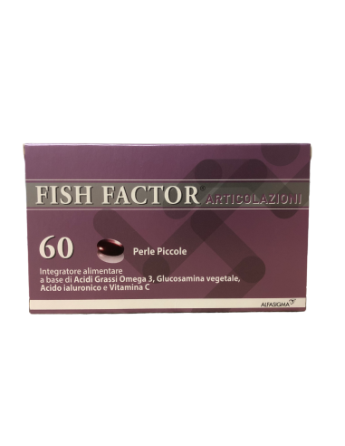 A cosa serve Fish Factor Articolazioni ? Fish Factor Articolazioni favorisce la funzione articolare ed il trofismo delle cartilagini grazie alla sua formula unica che fornisce un'integrazione complementare di Acidi Grassi Omega 3, Glucosamina Vegetale, Acido Ialuronico e Vitamina C. La glucosamina è utile per favorire il trofismo e la funzionalità delle articolazioni. La glucosamina contenuta in Fish Factor Articolazioni è derivata da una fermentazione vegetale ed è equivalente alla glucosamina derivata dai crostacei. Questo la rende adatta anche ai soggetti con allergie ai crostacei. L'acido ialuronico è un componente naturale della cartilagine indispensabile per mantenerne il grado di idratazione, la plasticità e la viscosità. La vitamina C favorisce la naturale sintesi del collagene, proteina responsabile della struttura e della funzionalità di ossa e cartilagini. Gli acidi grassi Omega 3 completano l'azione strutturale degli altri componenti, stimolando i naturali processi antiinfiammatori e attenuando le manifestazioni di dolore, gonfiore e irrigidimento. Formato: confezione da 60 perle. Come si usa Fish Factor Articolazioni La dose consigliata è di 2 perle al giorno da deglutire con acqua.