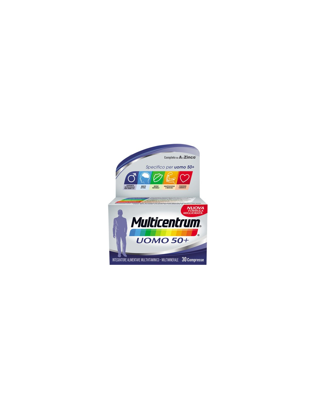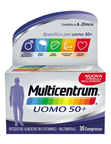 MulticentrumUOMO 50+ Integratore alimentare multivitaminico-multiminerale completo, formulato per soddisfare ifabbisogni nutrizionali degli uomini dopo i 50 anni.Con maggiori quantitativi di vitamina D, che contribuisce al mantenimento di ossa sane edella normale funzione muscolare.La vitamina D è importante per un efficiente assorbimento del calcio e permantenere una concentrazione fisiologica di calcio nel sangue, necessaria per la normalemineralizzazione delle ossa.Con livelli di vitamina B12, calcio e magnesio specifici per supportare le esigenzenutrizionali dell'uomo dopo i 50 anni.Con vitamina C, zinco, rame, selenio e vitamina B6 per supportare il buon funzionamentodel sistema immunitario.Con tiamina per aiutare a mantenere in salute la funzione cardiaca.Senza glutine.Caratteristiche nutrizionali Componenti in una compressa VNRVitamine:Vitamina A*50% come beta-carotene800 mcgVitamina E**24 mgVitamina C80 mgVitamina K30 mcgVitamina B1 (Tiamina)1,65mg150%Vitamina B2 (Riboflavina)150%Vitamina B6150%Vitamina B12300%Vitamina D300%Biotina150%Acido folico150%Niacina***150%Acidopantotenico9 mg150%Calcio200mg25%Fosforo105mg15%Magnesio135mg36%Ferro2,1mg15%Iodio100mcg67%Rame0,5mg50%Manganese2mg100%Cromo40mcg100%Molibdeno50mcg100%Selenio45mcg82%Zinco5mg50% VNR: Valori Nutritivi diRiferimento.*espressa come retinolo equivalenti.**espressa come alfa-tocoferolo equivalenti.***espressa come niacina equivalenti.Modalità d'usoPer adulti dai 50 anni in su, 1 compressa al giorno, anche lontano dai pasti, da ingerirecon acqua. Se necessario, la compressa può essere divisa in due parti perfacilitarne l'assunzione. AvvertenzeNon superare la dose giornaliera consigliata.Tenere fuori dalla portata dei bambini al di sotto dei tre anni.Gli integratori alimentari non vanno intesi come sostituti di una dieta varia edequilibrata e di uno stile di vita sano.ConservazioneConservare in un luogo asciutto, a temperatura non superiore ai 25°C, nellaconfezione originale ben chiusa. Non usare se all'apertura del tappo la lamina dialluminio del flacone risulta danneggiata. FormatoConfezione da 30 compresse.