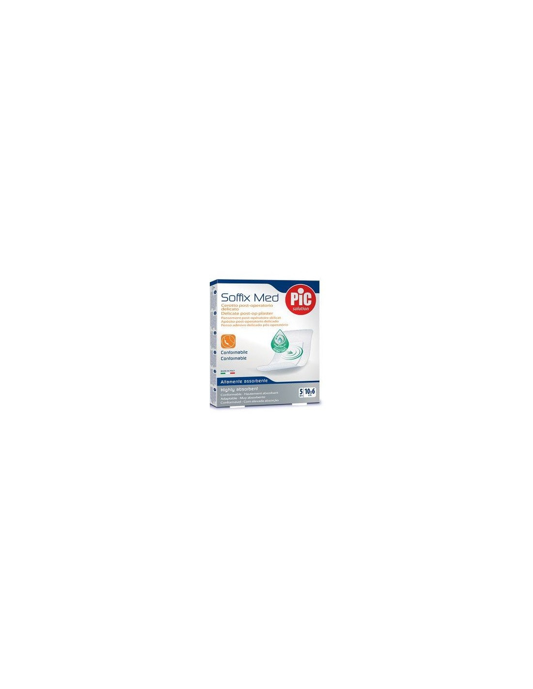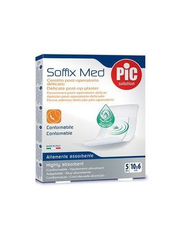 PIC Soffix Med Cerotto post-operatorio delicatoMedicazione in tessuto nontessuto per ferite chirurgiche ed estese con tampone con antibatterico (Clorexidina).Traspirante e altamente assorbente. Protegge la ferita dai rischi di infezione, grazie all’azione ad ampio raggio dellaClorexidina. In più, è un cerotto post-operatorio conformabile, morbido etraspirante pensato apposta per le pelli più sensibili e delicate.Formato5 Cerotti cm 10 x 6 cm Cod. 0002600100000