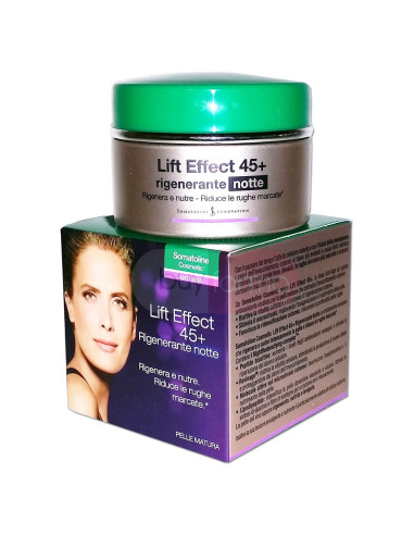 Caratteristiche Prodotto Con il passare del tempo l'attività cellulare rallenta e con l'inizio della menopausa i segni dell'invecchiamento cutaneo si fanno più evidenti a causa della carenza ormonale.Il viso perde tono, densità, le rughe diventano più marcate e possono comparire macchie cutanee. La linea Lift Effect 45+ ad azione antiossidante studiata per le pelli mature che contrasta l'invecchiamento cutaneo: - Riattiva la vitalità cellulare e il processo di rigenerazione cutanea- Stimola il microcircolo, migliorando l'ossigenazione e il nutrimento della pelle- Favorisce la ridensificazione cutanea, riducendo la profondità delle rughe Somatoline Lift Effect 45+ Rigenerante Notte contiene NightRedensifyng-complex: - Peptide bioattivo: Aumenta i livelli degli antiossidanti endogeni e stimola la riparazione del danno cellulare.- Revinage; Riattiva la vitalità cellulare, stimolando la produzione di nuove cellule e proteggendole dai danni dell'invecchiamento.- Molecole attive sul microcircolo cutaneo: Favoriscono l'ossigenazione e il nutrimento della pelle- Lipodipeptide: ridensifica la pelle donandole elasticità e volume, stimola la sintesi di elastina e fibre di sostegno per un'azione anti-rilassamento. La pelle del viso appare rigenerata, nutrita e levigata. Inoltre la sua texture avvolgente e nutriente è particolarmente adatta all'utilizzo notturno. Test clinico strumentali dimostrano che grazie all'utilizzo corretto e costante: - Riattiva il microcircolo cutaneo- Uniforma e rigenera la pelle- Riduce le rughe marcate- Riattiva la vitalità cellulare Consigli d'uso Si consiglia di applicare Lift Effect 45+ Rigenerante Notte sul viso deterso ogni sera, da solo o in combinazione con un altro trattamento della linea Lift Effect 45+ per un'azione ancora più efficace.L'utilizzo regolare anche dopo 4 settimane di trattamento aiuta a mantenere i risultati ottenuti.