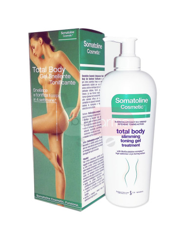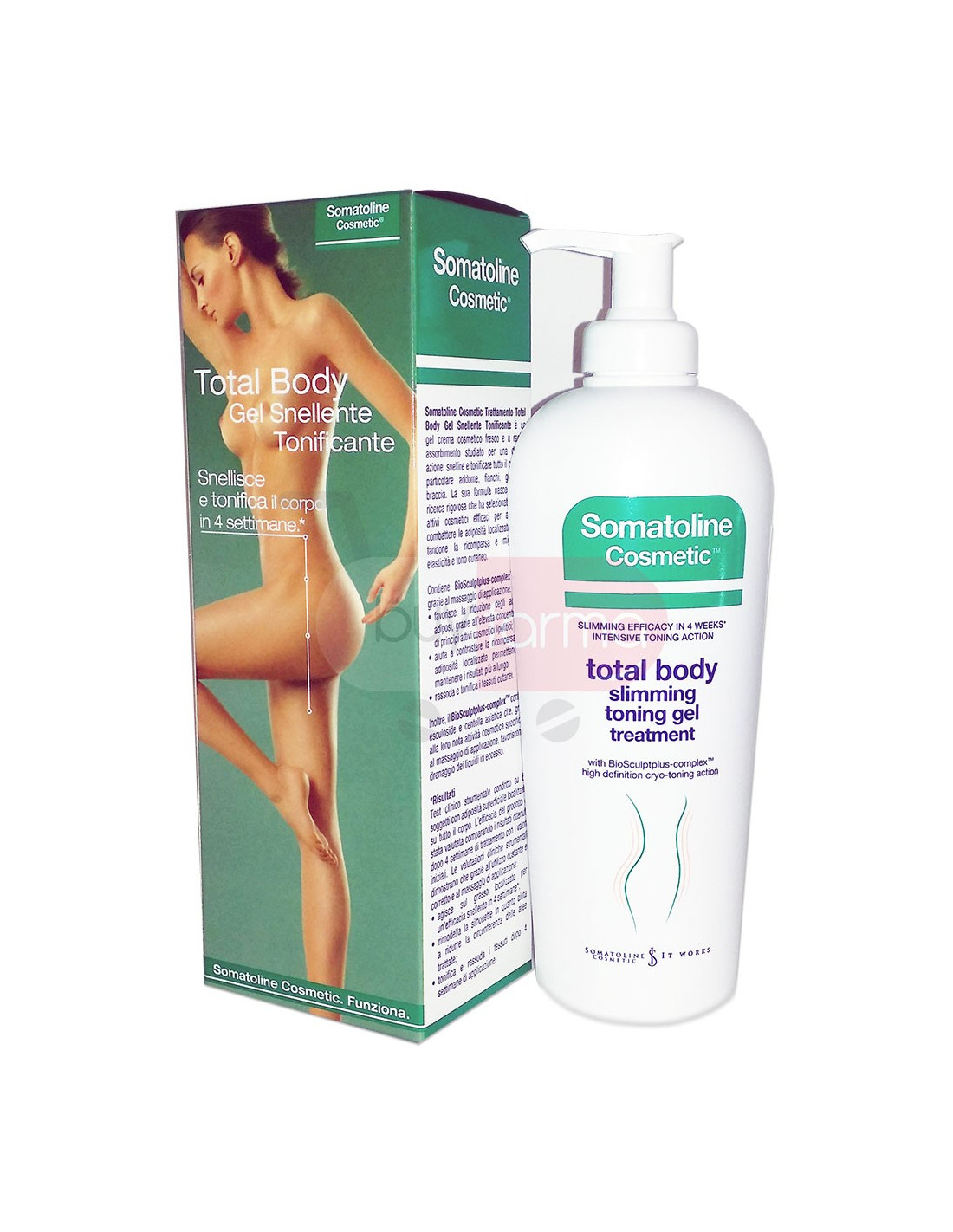 Caratteristiche Prodotto Somatoline Cosmetic Total Body Gel Snellente Tonificante nasce da una ricerca rigorosa che ha selezionato i principi attivi cosmetici efficaci per aiutare a combattere le adiposità localizzate, rallentandone la ricomparsa e migliorando elasticità e tono cutaneo. Contiene il BioSculptplus-complex che, grazie al massaggio di applicazione: - Favorisce la riduzione degli accumuli adiposi, grazie all'elevata concentrazione di principi attivi cosmetici lipolitici;- Aiuta a contrastare la ricomparsa delle adiposità localizzate permettendo di mantenere i risultati più a lungo;- Rassoda e tonifica i tessuti cutanei. Inoltre, il BioSculptplus-complex contiene esculoside e centella asiatica che, grazie alla loro nota attività cosmetica specifica e al massaggio di applicazione, favoriscono il drenaggio dei liquidi in eccesso. Le valutazioni cliniche strumentali dimostrano che grazie all'utilizzo costante e corretto e al massaggio di applicazione: - Agisce sul grasso localizzato per un'efficacia snellente in 4 settimane;- Rimodella la silhouette in 4 settimane, a ridurre la circonferenza delle aree trattate;- Tonifica e rassoda i tessuti dopo 4 settimane di applicazione. Consigli d'uso Si consiglia di applicare due volte al giorno per quattro settimane.