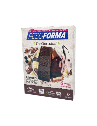 Caratteristiche del Prodotto Pesoforma offre una grande varietà di pasti sostitutivi completi ed equilibrati, con poche calorie e senza rinunciare al gusto. L'alleato della tua linea: - Ricco in proteine: 26%- Ricco in fibre- 226 kcal per pasto Attento al tuo benessere: - Con 13 vitamine e 11 minerali- Senza Edulcoranti, coloranti e conservanti E amico dell'ambiente: - Senza olio di palma- Pesoforma lavora insieme ad UTZ per la coltivazione del cacao. Pesoforma Tre Cioccolati sono comode barrette che puoi portarle ovunque, per un pranzo a sole 226 kcal.Sono sviluppate appositamente per essere inserite in una dieta ipocalorica.