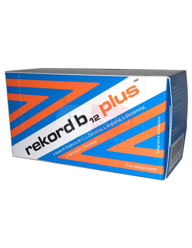 A cosa serve Rekord B12 Plus ? Rekord B12 Plus è un integratore alimentare utile in tutti i casi di ridotto apporto causati da dieta o di un aumentato fabbisogno di Vitamina b12, L-Carnitina e di Aminoacidi (L-Arginina, L-Glutamina, L-Serina e L-Treonina).Rekord B12 Plus, grazie alla Vitamina B12 contenuta in esso, contribuisce al normale metabolismo energetico, favorisce il normale funzionamento del sistema nervoso e riduce la stanchezza, l'affaticamento ed in generale i cali di produttività. Formato: 10 flaconcini da 10 ml Come usare Rekord B12 Plus Si consiglia di assumere la dose raccomandata di 1-2 flaconcini al giorno.
