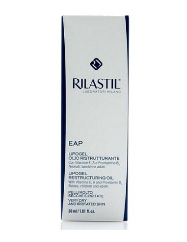 RILASTILEAPLIPOGEL OLIO RISTRUTTURANTE Con Vitamine E, A e Provitamina B5 Neonati, bambini ed adultiPELLI MOLTO SECCHE E IRRITATE Trattamento specifico per pelli molto secche e irritate, a base di Vitamine E, A e Provitamina B5. E' indicato per le aree localizzate di viso, labbra e zone del corpo con cute sensibile, sottile o irritabile. Favorisce la funzione barriera dell'epidermide con un'azione emolliente, idratante e lenitiva. Protegge le zone trattate dalle aggressioni degli agenti esterni (screpolature da freddo di guance, mani e labbra, irritazioni da succhietto e pannolino, secchezza localizzata, prurito). Componenti Senza conservanti, profumo, coloranti e derivati del grano, ipoallergenico, clinicamente, dermatologicamente e microbiologicamente testato, testato per Nickel, Cobalto, Cromo, Palladio e Mercurio.Formato Confezione da 30 mlCod.7510V