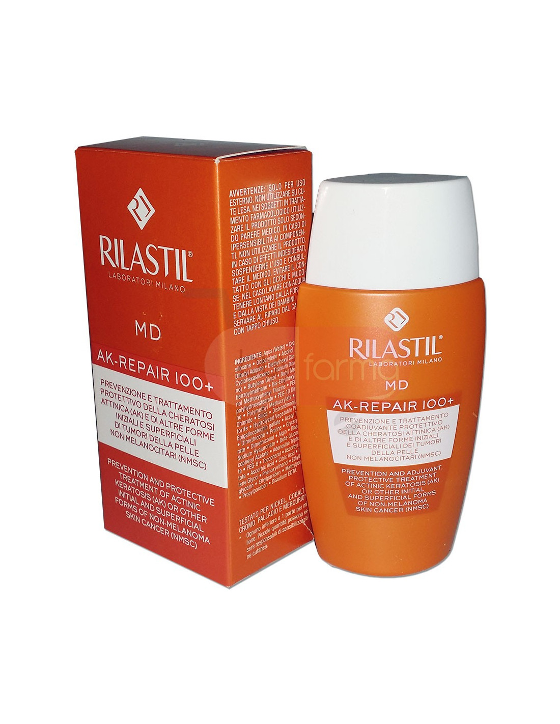 A cosa server Rilastil MD Ak-Repair 100 ? L'effetto cumulativo dell'esposizione solare può causare alterazioni della cute come la cheratosi attinica (AK). Rilastil MD AK-Repair emulsione fluida è particolarmente consigliata per soggetti con una storia precedente di tumore cutaneo non melanomico (NMSC) o con predisposizione generica per familiarità. Il prodotto crea una barriera protettiva in grado di preservare il microambiente cutaneo. Riduce eventuali sintomi quali arrossamento, prurito e bruciore e, per la presenza di filtri solari ad ampio spettro e ad alta protezione, previene i danni causati dall'esposizione solare. Formato: 100ml Fattore Protettivo: SPF 100 Come usare Rilastil MD Ak-Repair 100 Si consiglia di agitare il flacone prima di applicare su pelle pulita con leggero massaggio fino a completo assorbimento, due volte al giorno, al mattino e nel primo pomeriggio. In caso di esposizione al sole applicare almeno 30 minuti prima e ripetere ogni 2 ore. Riapplicare subito dopo aver lavato o in caso di intensa sudorazione dell'area di applicazione.