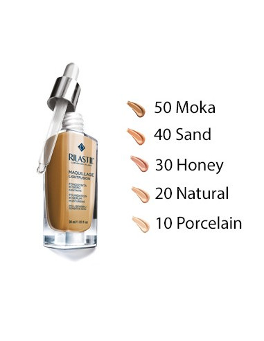RILASTIL MAQUILLAGE FONDOTINTA IN SIERO Rilastil Maquillage Fondotinta in siero ultra fluido idratante e protettivo lascia un impercettibile velo di make-up sulla pelle per un effetto naturale, uniforme e luminoso. La pipetta ad alta precisione rilascia la giusta dose di prodotto per un finish leggero e preciso.Ingredienti Aqua (water), dimethicone, talc, ethylhexyl methoxycinnamate, peg-10 dimethicone, isododecane, hdi/trimethylol hexyllactone crosspolymer, glycerin, acrylates/polytrimethylsiloxymethacrylate copolyme, titanium dioxide, cetyl peg/ppg-10/1 dimethicone, sodium chloride, hydrogen dimethicone, diethylhexyl syringylidenemalonate, silica, aluminum hydroxide, disteardimonium hectorite, lecithin, triethoxycaprylylsilane, caprylic/capric triglyceride, propylene carbonate, arginine, tocopherol, ascorbyl palmitate, disodium adenosine triphosphate, mannitol, pyridoxine hcl, rna, histidine hcl, phenylalanine, citric acid, tyrosine, phenoxyethanol, sodium dehydroacetate, benzoic acid, dehydroacetic acid, ethylhexylglycerin, CI 77891 (titanium dioxide), CI 77492 (iron oxides), CI 77491 (iron oxides), CI 77499 (ironoxides).Modalità d'uso Utilizzare dopo la routine di trattamento o dopo il primer. Agitare bene prima dell’uso, stendere dal centro del viso verso l'esterno.Formato Flacone da 30 ml.Cod. I21V05760, I21V05770, I21V05780, I21V05790, I21V05800