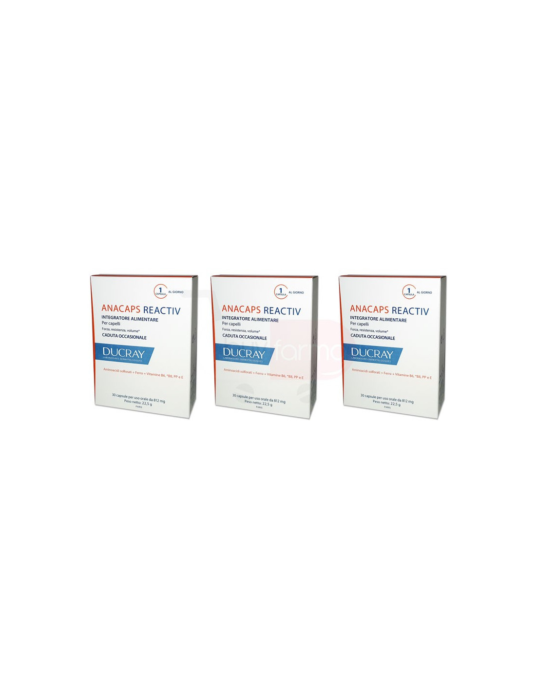 A cosa serve Ducray Anacaps Reactiv ? Il capello è costituito per gran parte da una proteina, la cheratina che a sua volta è costituita da Cisteina, un aminoacido solforato.La vitalità dei capelli può essere minacciata da fattori cronici (ormonali o vascolari) che causano episodi progressivi e ripetuti di perdita dei capelli. La formula di Anacaps Reactivapporta al bulbo pilifero la biotina (vitamina B8), lo zinco e il selenio che aiutano a mantenere il capello sano e la vitamina B6 che contribuisce alla normale sintesi della cisteina.Inoltre la vitamina B6 contribuisce alla regolazione dell'attività ormonale.L'uso di questo integratore è indicato nei casi di caduta occasionale. Ducray Anacaps Reactiv non può essere utilizzato durante la gravidanza o l'allattamento. Formato: 3 confezioni da 30 Capsule, per un totale di 90 Capsule, utili per 90 Giorni di Trattamento Continuo. Come usare Ducray Anacaps Reactiv Si consiglia di assumere una capsula gel al mattino con un bicchiere d'acqua.Si consiglia di continuare il trattamento per un periodo di 3 mesi.