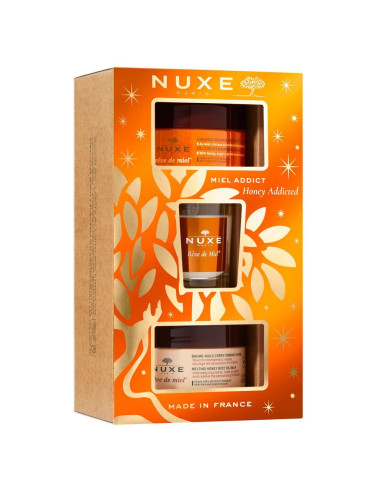 Questo cofanetto contiene: Esfoliante Goloso Nutriente Corpo 175ml: Questo scrub dal profumo mielato e floreale e dalla texture unica in balsamo-olio esfolia e avvolge la pelle con un velo protettivo nutriente. Balsamo Olio Corpo Fondente 200ml: Questo balsamo-olio corpo al miele e agli oli vegetali preziosi nutre intensamente, ripara e allevia le sensazioni di irritazione. Candela Rêve de Miel® 70g: Lasciati tentare dalla fragranza ammaliante di Rêve de Miel con questa candela per interni al profumo di fiore d’arancio, note mielate e legno di sandalo. Trattamenti formulati e prodotti in Francia. Cofanetto prodotto in Francia, 100% riciclabile. Modo d’uso Esfoliante goloso nutriente corpo: Applica l’esfoliante sulla pelle detersa ancora umida, massaggia con movimenti circolari poi risciacqua con acqua. Utilizzalo 1-2 volte la settimana per una pelle esfoliata e visibilmente più bella. Balsamo olio corpo fondente al miele: Applicalo su tutto il corpo quotidianamente, massaggiando delicatamente fino a che la sua texture si trasforma in olio. Ingredienti Esfoliante Goloso Nutriente Corpo: GLYCERIN, HELIANTHUS ANNUUS (SUNFLOWER) SEED OIL, ORYZA SATIVA (RICE) POWDER, PHENYL TRIMETHICONE, SUCROSE, PARFUM/FRAGRANCE, SODIUM ACRYLATES COPOLYMER, TOCOPHEROL, MEL/HONEY, PHENOXYETHANOL, LECITHIN, SODIUM GLUCONATE, ARGANIA SPINOSA KERNEL OIL, BORAGO OFFICINALIS SEED OIL, BUTYROSPERMUM PARKII (SHEA) BUTTER, CARAMEL, SOLANUM LYCOPERSICUM (TOMATO) FRUIT EXTRACT, CITRIC ACID [N3104/A]. Balsamo Olio Corpo Fondente: AQUA /WATER, DICAPRYLYL ETHER, COCO-CAPRYLATE/CAPRATE, ALCOHOL DENAT., GLYCERIN, BEHENETH-25, BEHENYL ALCOHOL, HELIANTHUS ANNUUS (SUNFLOWER) SEED OIL, ARGANIA SPINOSA KERNEL OIL, BORAGO OFFICINALIS SEED OIL, HELIANTHUS ANNUUS (SUNFLOWER) SEED OIL UNSAPONIFIABLES, MEL/HONEY, PARFUM/FRAGRANCE, TOCOPHEROL, ACRYLATES/C10-30 ALKYL ACRYLATE CROSSPOLYMER, PHENOXYETHANOL, ETHYLHEXYLGLYCERIN, SODIUM GLUCONATE, XANTHAN GUM, SODIUM HYDROXIDE, GLYCINE SOJA (SOYBEAN) OIL, SOLANUM LYCOPERSICUM (TOMATO) FRUIT EXTRACT, BETA-CAROTENE, DAUCUS CAROTA SATIVA (CARROT) ROOT EXTRACT [N3105/A].
