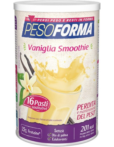 PESOFORMA Vaniglia Smoothie Descrizione Pasto sostitutivo per la perdita e controllo del peso, completo ed equilibrato (contiene 23 micronutrienti). Ricco in proteine, con fibre.Con cacao UTZ da coltivazione sostenibile. 201 kcal a pasto. Gusto: vaniglia. Senza olio di palma ed edulcoranti.Ingredienti Zucchero, inulina, olio di soia in polvere (olio di soia ra nato, sciroppo di glucosio, proteine del latte, aroma naturale), maltodestrina, proteine del latte (emulsionanti: lecitine), proteine idrolizzate di frumento, addensanti: metilcellulosa, gomma di xanthan; minerali (potassio, magnesio, calcio, ferro, zinco, iodio, manganese, rame, selenio), sale, aromi, vitamina (C, E, niacina, acido pantotenico, A, D, tiammina, B6, B12, ribo avina, K, acido folico, biotina), aroma naturale (latte), coloranti: caroteni. Contiene glutine e lattosio. Può contenere tracce di uova, pesce, frutta a guscio, sedano, sesamo e lupini.Caratteristiche nutrizionaliValori mediper 100 gper pastoEnergia1676 kJ400 kcal849 kJ201 kcalGrassidi cui acidi grassi saturi12 g2,1 g3,5 g0,8 gCarboidratidi cui zuccheri52 g42 g27 g24 gFibre18 g4,9 gProteine12 g13 gSale1 g0,65 gModalità d'uso Preparazione: 2 misurini di prodotto da ricostituire con 200 ml di latte scremato. Misurino inserito all'interno della confezione.Formato Barattolo da 436 g in polvere.Cod. 217414