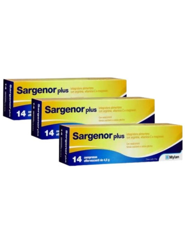 A cosa serve Sargenor Plus da 14 Compresse ? Ogni giorno siamo sottoposti a un ritmo di vita frenetico, fatto di mille impegni che gravano sul fisico e sulla mente.Quando accumuliamo troppa stanchezza ci sentiamo spossati, con una scarsa capacità di concentrazione. In poche parole "esauriti". Esistono situazioni di particolare impegni fisico, psichico o di eccessivo affaticamento che sono accompagnate da uno stati di astenia, anche marcata, che certamente interferisce negativamente con la qualità della vita. I sintomi che si accompagnano all'astenia, cioè la sensazione di non essere in grado di compiere uno sforzo ancor prima di averlo cominciato, possono interessare il sonno (insonnia, sonno agitato), la mente (difficoltà di concentrazione, turbe della memoria e dell'attenzione), il carattere (pessimismo, malinconia, demotivazione, tristezza). Il riposo, una corretta alimentazione e un'adatta attività fisica sono generalmente corrette misure valide per fronteggiare la situazione.Sargenor Plus contiene vitamina C, arginina e magnesio.L'arginina è un aminoacido normalmente presente nel nostro organismo e in una dieta equilibrata, dotato di importanti caratteristiche nutrizionali biochimiche.La vitamina C contribuisce alla normale funzione del sistema immunitario.Il magnesio contribuisce alla riduzione della stanchezza e dell'affaticamento. Composizione: Arginina, vitamina C e magnesio. Senza zuccheri. Senza glutine. Formato: 3 confezioni da 14 Compresse Effervescenti per un totale di 42 unità. Come usare Sargenor Plus Si consiglia di assumere una compressa effervescente con un bicchiere d'acqua (almeno 100ml).In pochi minuti la compressa verrà disciolta dando luogo ad una gradevole bevanda effervescente.È consigliata 1 assunzione giornaliera, preferibilmente al mattino, per un periodo non superiore a 1 mese.