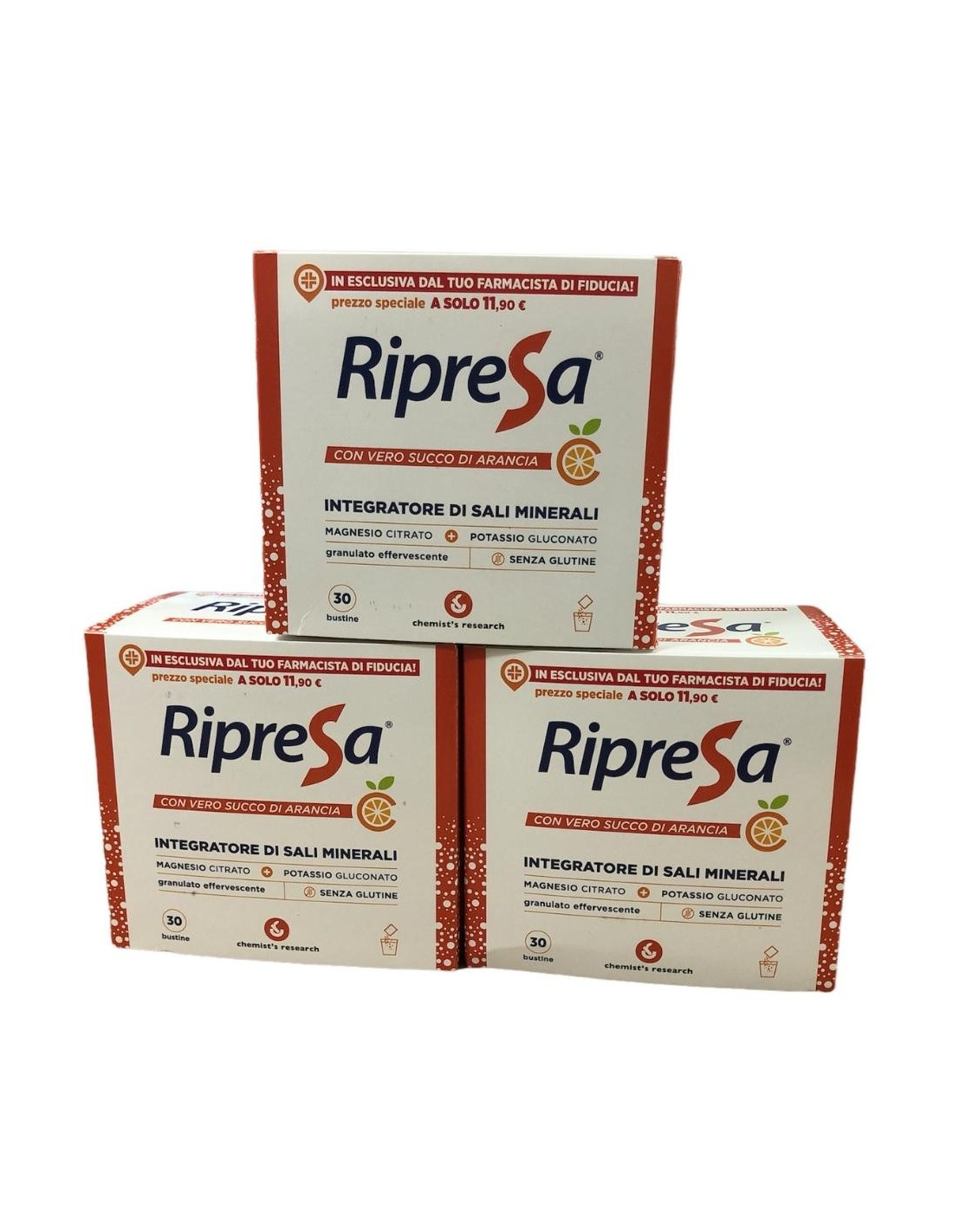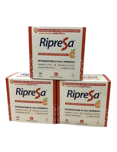 Ripresa Integratore Alimentare di Sali Minerali da 30 Bustine Integratore alimentare di Magnesio e Potassio con Acido Aspartico, utile per colmare le carenze di tali nutrienti che si possono manifestare con eccessiva stanchezza psico-fisica. Il Magnesio può inoltre risultare utile per la fisiologica funzione muscolare. Integratore di Sali Minerali con vero succo di arancia Magnesio Citrato + Potassio Gluconato granulato effervescente senza glutine. IngredientiSaccarosio, correttori di acidità: Acido citrico; Carbonato acido di sodio; Gluconato di Potassio; Magnesio citrato bibasico; Acido L'Aspartico; Aroma; Succo di Arancia disidratato. Formato: 3 confezioni da 30 bustine per un totale di 90 bustine (PROMO PACK). Consigli d'uso Si consiglia l'assunzione di 1 bustina due volte al giorno fino a un massimo di 3 bustine al giorno. Sciogliere il contenuto di una bustina in un bicchiere d'acqua.Si raccomanda un ciclo di assunzione di almeno 2 settimane.