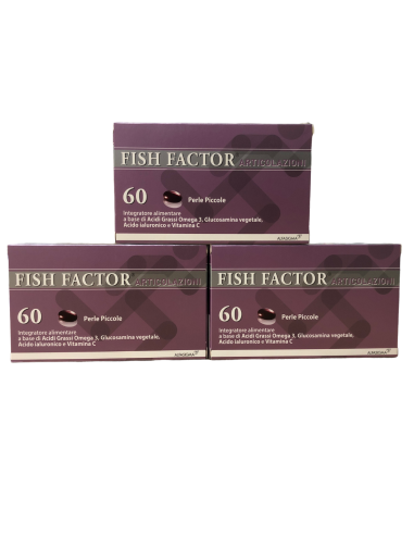 A cosa serve Fish Factor Articolazioni ? Fish Factor Articolazioni favorisce la funzione articolare ed il trofismo delle cartilagini grazie alla sua formula unica che fornisce un'integrazione complementare di Acidi Grassi Omega 3, Glucosamina Vegetale, Acido Ialuronico e Vitamina C. La glucosamina è utile per favorire il trofismo e la funzionalità delle articolazioni. La glucosamina contenuta in Fish Factor Articolazioni è derivata da una fermentazione vegetale ed è equivalente alla glucosamina derivata dai crostacei. Questo la rende adatta anche ai soggetti con allergie ai crostacei. L'acido ialuronico è un componente naturale della cartilagine indispensabile per mantenerne il grado di idratazione, la plasticità e la viscosità. La vitamina C favorisce la naturale sintesi del collagene, proteina responsabile della struttura e della funzionalità di ossa e cartilagini. Gli acidi grassi Omega 3 completano l'azione strutturale degli altri componenti, stimolando i naturali processi antiinfiammatori e attenuando le manifestazioni di dolore, gonfiore e irrigidimento. Formato: 3 confezioni da 60 perle per un totale di 180 perle. Come si usa Fish Factor Articolazioni La dose consigliata è di 2 perle al giorno da deglutire con acqua.