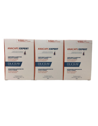 A cosa serve Anacaps Expert Integratore per Capelli e Unghie ? Anacaps Expert Integratore per Capelli e Unghie è un integratore in grado di proteggere e mantenere il capello in buono stato.La sua formula contiene: Vitamina B8 (biotina), che aiuta a mantenere i capelli normali; Mirtillo, che partecipa alla funzionalità del microcircolo; Zinco, che aiuta a mantenere unghie e capelli normali e protegge le cellule dallo stress ossidativo; Vitamina B6, che contribuisce alla normale sintesi della cisteina. Formato: 3 confezioni da 30 capsule per un totale di 90 capsule, trattamento completo di 3 mesi. Come si usa Anacaps Expert Integratore per Capelli e Unghie Assumere una capsula al mattino con un bicchiere d'acqua.Si consiglia di continuare il trattamento per un periodo di 3 mesi.