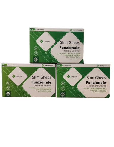 A cosa serve Slim Gheos Funzionale ? Slim Gheos Funzionale è un integratore alimentare a base di estratti vegetali di Garcinia, Alga Wakamè e Tè Verde che favoriscono l'equilibrio del peso corporeo, stimolando la depurazione dell'organismo e controllando la sensazione di fame nervosa, in modo da ridurre l'appetito.Per favorire anche il metabolismo di grassi, carboidrati e proteine, Slim Gheos Funzionale contiene anche Gimnema, Cardo Mariano, Alga Kombu e Cromo; favorisce, dunque, anche la perdita di peso.Inoltre è presente estratto di Caffè Verde, utile per la sua azione tonica, capace di supportare il metabolismo energetico, riducendo stanchezza e affaticamento, tipici delle prime fasi di una dieta. Formato: 3 confezioni da 60 compresse per un totale di 180 compresse. Come si usa Slim Gheos Funzionale Si consiglia di assumere 1 compressa prima di pranzo ed 1 compressa prima di cena con abbondante acqua.