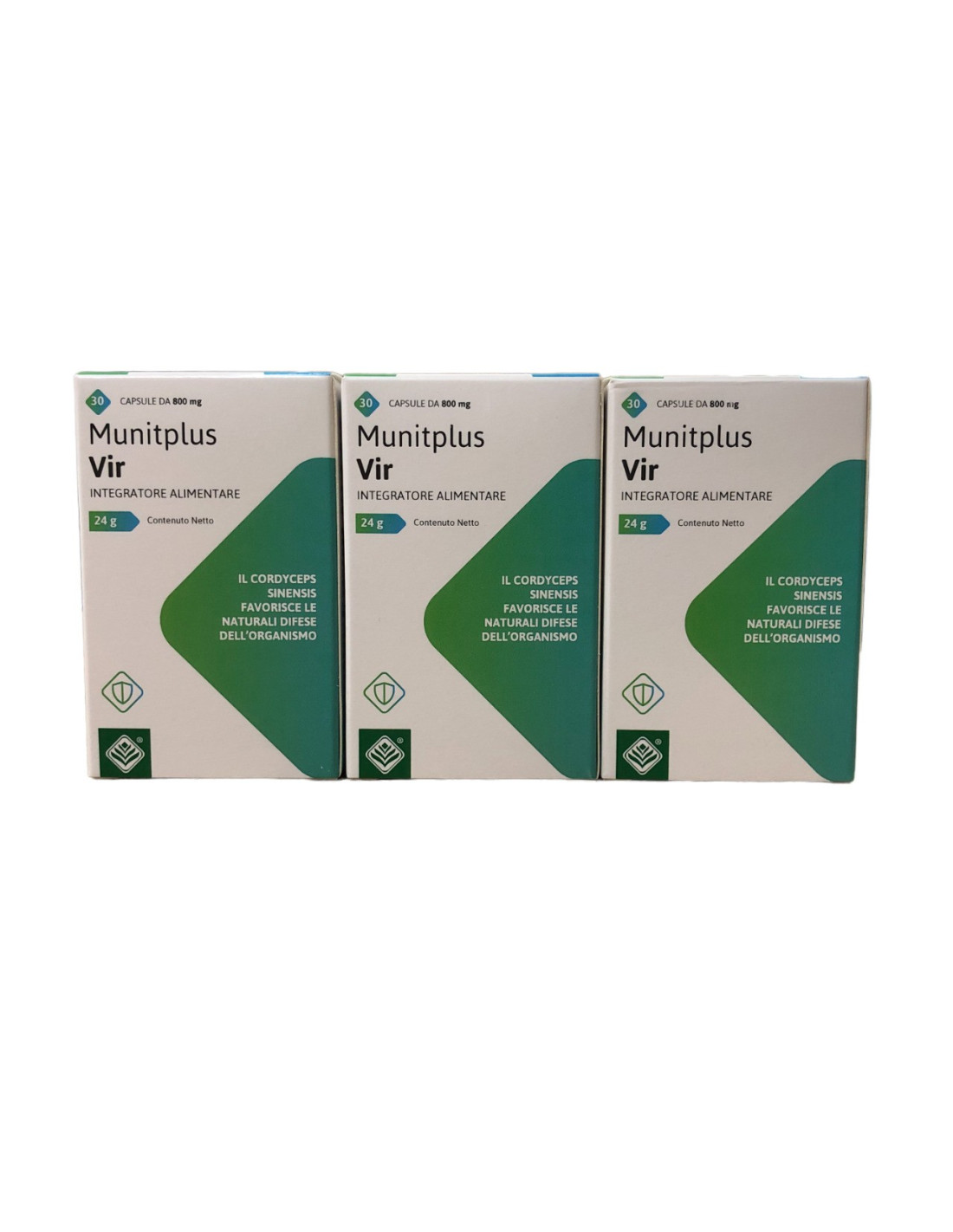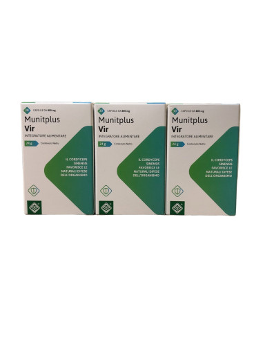 A cosa serve Munitplus Vir ? Munitplus Vir serve per alzare le difese immunitarie dell'organismo, contiene: Quercetina e Lattoferrina Zinco che contribuisce alla normale funzione del sistema immunitario. Cordyceps sinensis che favorisce le naturali difese dell’organismo. Estratti di Curcuma e di Tè verde dalle note proprietà antiossidanti. Selenio che contribuisce alla protezione delle cellule dallo stress ossidativo. Formato: 3 confezioni da 30 Capsule per un totale di 90 capsule. Come usare Munitplus Vir Si consiglia di assumere una capsula al giorno preferibilmente a stomaco vuoto, accompagnata da un sorso d’acqua.