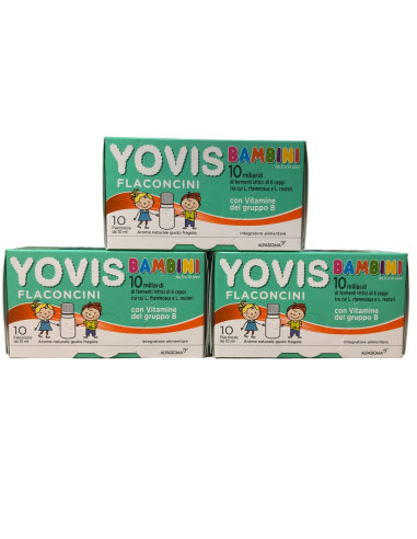 A cosa serve Yovis Bambini in Flaconcini ? Yovis Bambini da 10 Flaconcini è un integratore alimentare a base di fermenti lattici vivi, vitamine del gruppo B e finocchio, ha una formulazione esclusiva perché contiene componenti selezionati per i bambini dai 3 ai 14 anni: 10 miliardi di fermenti lattici di 6 ceppi diversi, per favorire l’equilibrio della flora batterica intestinale; vitamine del gruppo B scelte per il benessere del bambino, tra cui vitamina B6 e B12, che contribuiscono alla normale funzione del sistema immunitario, alla riduzione della stanchezza e dell’affaticamento e al normale metabolismo energetico e vitamina B3, importante per la salute gastrointestinale, perché contribuisce al mantenimento di membrane mucose sane; finocchio, che regolarizza la motilità gastrointestinale e, al tempo stesso, favorisce l'eliminazione dei gas. L’aroma naturale al gusto fragola e il pratico formato in flaconcini bevibili lo rendono piacevole e comodo da assumere. Con edulcorante, senza zuccheri. Formato: 3 confezioni da 10 flaconcini da 10 ml per un totale di 30 flaconcini. Come si usa Yovis Bambini in Flaconcini Seguire i seguenti passaggi: Avvitare il tappo in senso orario per rompere il sigillo di sicurezza. Continuare ad avvitare in senso orario fino a fine corsa. Agitare bene il flaconcino fino a completa dissoluzione della polvere. Svitare il tappo in senso antiorario e bere il contenuto. Si consiglia l’assunzione di 1 flaconcino al giorno, preferibilmente lontano dai pasti.In caso di terapia antibiotica assumere ad alcune ore di distanza dal farmaco.E’ anche possibile sciogliere il prodotto in yogurt, succhi di frutta, acqua e altre bevande o liquidi (non caldi e non gassati).
