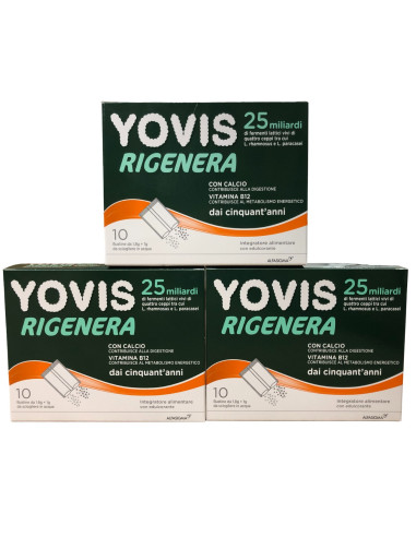 A cosa serve Yovis Rigenera 50+ ? Yovis Rigenera è un integratore di fermenti lattici le cui sostanze funzionali sono state esclusivamente selezionate per i soggetti dai cinquanta anni, infatti contiene: 25 miliardi di fermenti lattici vivi di quattro ceppi tra cui L. rhamnosus e L. paracasei; prebiotici, gluco-oligosaccaridi, che favoriscono l'equilibrio della ora intestinale, migliorandone la funzionalità; calcio, che contribuisce alla normale funzione degli enzimi digestivi e al mantenimento di ossa normali; vitamina B12, che contribuisce alla riduzione di stanchezza e affaticamento, al normale metabolismo energetico. Senza glutine, lattosio e zuccheri. Formato: 3 confezioni da 10 bustine per un totale di 30 bustine. Come si usa Yovis Rigenera 50+ Seguire i seguenti passaggi: Piegare la bustina lungo il taglio verticale; Aprire entrambe le parti seguendo il tratteggio orizzontale; Versare il contenuto in un bicchiere e aggiungere acqua o altra bevanda (150ml); Mescolare bene prima di bere la soluzione. Si consiglia l'assunzione di una bustina al giorno, preferibilmente lontano dai pasti. Cosa contiene Yovis Rigenera 50+ Parte 1: probiotici: polvere frutto-oligosaccaridi a corta catena; miscela di fermenti di cui: Lactobacillus rhamnosus DSM 16104, Lactobacillus paracasei DSM 16105, Bifidobacterium Breve DSM 33680, Bifidobacterium animalis ssp. Lactis DSM 17741; amido di mais; agente antiagglomerante: biossido di silicio. Parte 2: prebiotici: gluco-oligosaccaridi; carbonato di calcio (maltodestrina), maltodestrina, aromi; acidificante: acido citrico; agente antiagglomerante: biossido di silicio; edulcorante: sucralosio; polvere cianocobalamina (vitamina B12, acido citrico, maltodestrina, citrato trisodico). Contiene edulcorante.