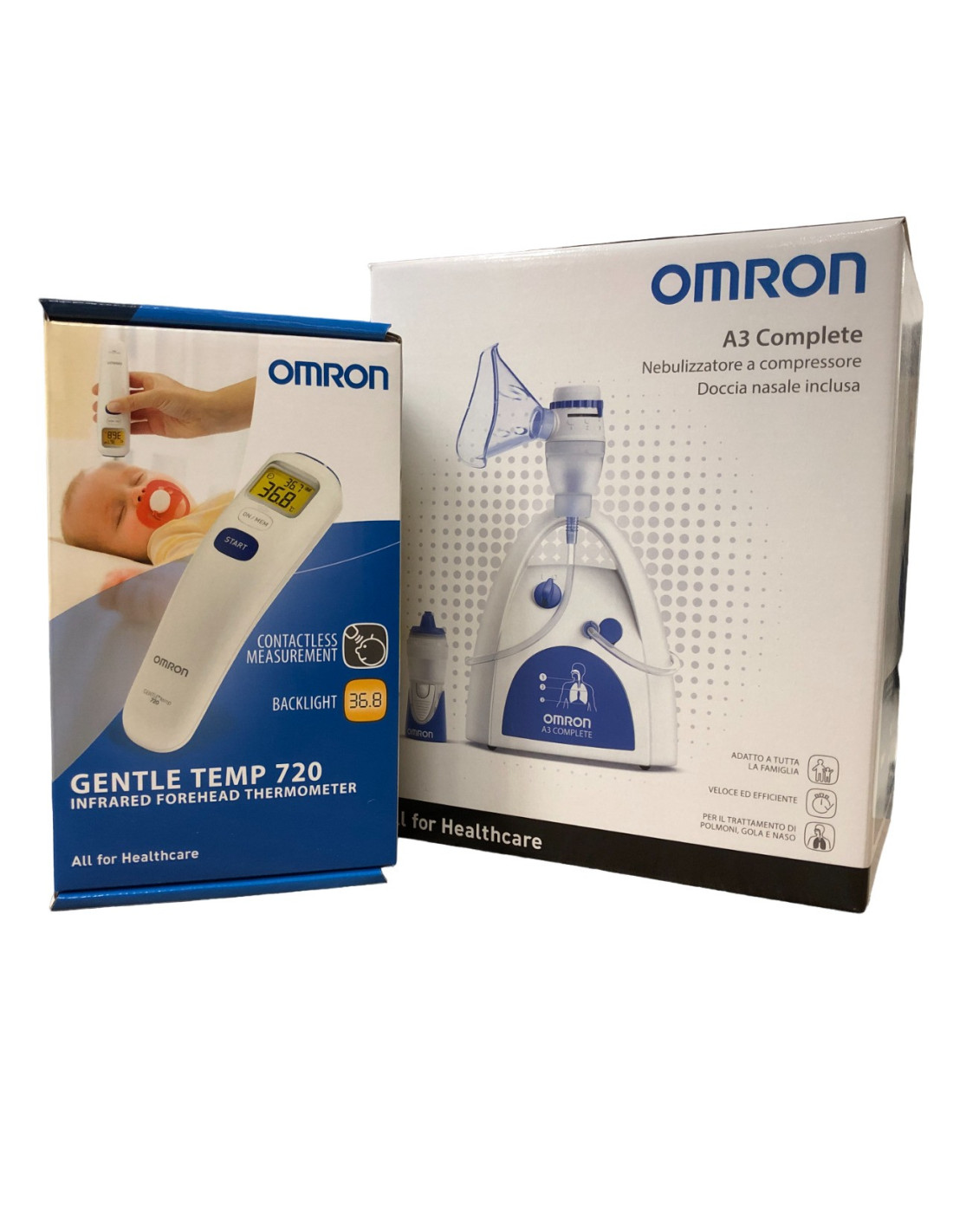 Caratteristiche Omron A3 Complete Aerosol Omron A3 Complete è una soluzione completa di nebulizzazione per un'ampia varietà di problemi respiratori.Omron A3 Complete è adatto a tutta la famiglia, veloce ed efficiente e utile per il trattamento di polmoni, gola e naso. Utilizzatori ai quali è destinato il prodotto: Personale medico legalmente abilitato (medici, infermieri, terapisti); Per il trattamento in casa, l'assistenza domiciliare o il paziente sotto la guida di personale medico qualificato; L'utilizzatore deve inoltre essere in grado di comprendere in linea generale il funzionamento del dispositivo Omron A3 Complete e il contenuto del manuale di istruzioni. Pazienti ai quali è destinato il prodotto: Persone che soffrono di problemi respiratori e hanno la necessità di assumere farmaci per inalazione oppure di effettuare il lavaggio delle cavità nasali e delle cavità rinofaringea. Ambiente: Omron A3 Complete è destinato all'utilizzo domestico. Con Omron A3 Complete troverete una soluzione 3 in 1 ottimo per vie aeree superiori, vie aeree medie e vie aeree inferiori. Garanzia: 3 anni. DESCRIZIONE COMPLETA ALL'INTERNO DELLA RELATIVA PAGINA PRODOTTO. Caratteristiche Termometro Frontale Senza Contatto Omron Grazie al termometro frontale ad infrarossi Omron Gentle Temp 720 potrete misurare la temperatura corporea sulla fronte, ma può essere utilizzato anche per misurare la temperatura di una superficie, ad esempio un biberon o un vasetto di pappe, e per misurare la temperatura di una stanza.Omron Gentle Temp 720 Termometro ha una memoria per 25 misurazioni, rendendo possibile il monitoraggio di una temperatura nel tempo per stabilire un andamento.Le temperature vengono visualizzate in gradi Celsius o Fahrenheit e appaiono sullo schermo entro 1 secondo.Il display retroilluminato del termometro Gentle Temp Omron assicura una facile lettura anche di notte, in modo da permettere una misurazione ai bambini senza accendere la luce. Caratteristiche principali: Termometro versatile per corpo, ambiente e oggetti; Memoria di 25 misurazioni; Display retroilluminato; Termometro a infrarossi; Funziona a batteria; Con allarme febbre; Dimensioni: 45 x 39 x 155 mm; Garanzia: 3 anni. DESCRIZIONE COMPLETA ALL'INTERNO DELLA RELATIVA PAGINA PRODOTTO.