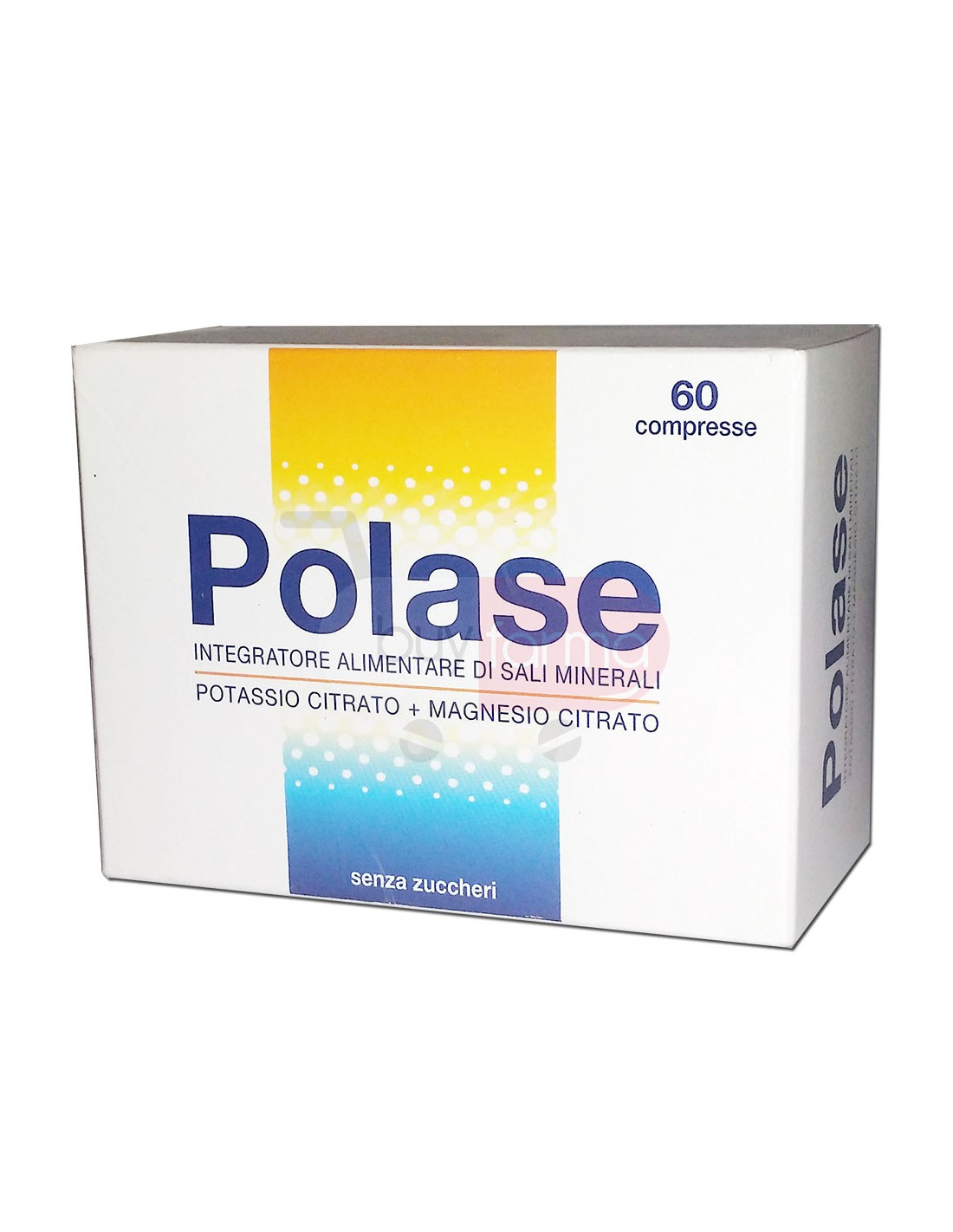 A cosa serve Polase Integratore di Sali Minerali Senza Zuccheri ? I minerali sono essenziali per il nostro organismo e rappresentano circa 6% del peso corporeo.Devono essere assunti quotidianamente in quanto non siamo in grado di sintetizzarli, di conseguenza è necessario un corretto apporto nutrizionale per permettere lo svolgimento ottimale delle funzioni metaboliche del nostro organismo.È importante ricordare che la sudorazione è un meccanismo fisiologico che può determinare la diminuzione di sali minerali, la cui integrazione è fondamentale per il mantenimento di un metabolismo salutare. In particolare, Magnesio e Potassio sono tra i minerali più abbondanti nell'organismo. Il Magnesio è largamente presente all'interno delle cellule dov'è coinvolto in oltre 300 reazioni enzimatiche mediante le quali i principali nutrienti (proteine, lipidi, carboidrati) vengono utilizzati dando origine a nuovi composti essenziali per l'organismo.Il Magnesio contribuisce al normale metabolismo energetico, alla normale funzione muscolare e nervosa e alla riduzione di stanchezza e fatica.Contribuisce inoltre al mantenimento dell'equilibrio elettrolitico. Il Potassio è il minerale più diffuso all'interno delle cellule dove svolge un importante ruolo in numerosi processi fisiologici.Le principali funzioni del Potassio sono strettamente collegate alla sua diversa concentrazione all'interno e all'esterno delle cellule contribuendo alla normale funzione muscolare e nervosa.Contribuisce inoltre al mantenimento di una normale pressione sanguigna. Non contiene saccarosio o altri zuccheri e pertanto può essere assunto da soggetti con un regime dietetico che prevede assenza di zucchero.Senza Glutine. Polase è disponibile su buyfarma in diversi formati. Formato: 60 compresse. Come usare Polase Integratore di Sali Minerali Senza Zuccheri Per adulti si consiglia di assumere due compresse deglutibili dopo i due pasti principali fino ad un massimo di 6 compresse al giorno.Si raccomanda di continuare la somministrazione di Polase per almeno due settimane.