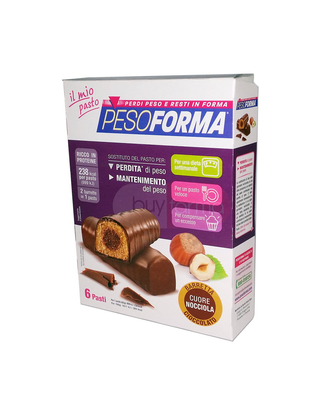 Caratteristiche Prodotto I Pasti Pesoforma si integrano perfettamente in una dieta settimanale a 1200 kcal giornaliere perché: - Sono ipocalorici: con solamente 238 kcal per pasto- Sono ricchi in proteine: le proteine contribuiscono al mantenimento della massa muscolare- Apportano tutti i nutrienti essenziali per il tuo benessere (Vitamine e minerali, proteine. carboidrati e lipidi). I Pasti Pesoforma sono un'ottima soluzione per sostituire in modo completo ed equilibrato un pasto perché: - Hanno un corretto equilibrio tra macronutrienti: proteine, carboidrati e lipidi- Contengono 12 vitamine e 11 minerali per evitare sensazioni di stanchezza o cali del rendimento Puoi portare i pasti sostitutivi sempre con te, per un pasto pratico e veloce anche fuori casa. I Pasti Pesoforma permettono di bilanciare l'apporto calorico giornaliero: - Per complensare gli eccessi del giorno prima- Per mantenersi leggeri in vista di un pasto abbondante La perdita di peso è ottenuta nell'ambito di un regime alimentare ipocalorico ed i pasti sostitutivi devono essere utilizzati necessariamente in associazione ad altri alimenti.Durante la dieta è molto importante mantenere giornalmente un adeguato apporto di liquidi (acqua, tè e tisane senza zucchero). Pesoforma Barrette Cioccolato Cuore Nocciola non contengono olio di palma.Per un pasto (62g): 999kJ / 238 kcal | Per 100g: 1611 kJ / 384 kcal Consigli d'uso Per un pasto sostitutivo occorrono due Barrette di Cioccolato Cuore Nocciola.La confezione contiene 6 Pasti Sostitutivi per un totale di 12 Barrette.