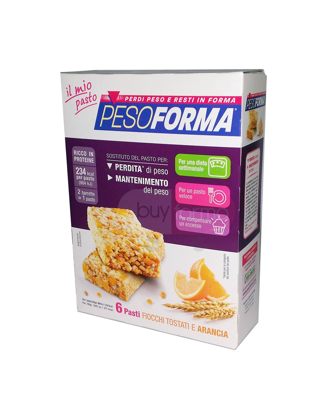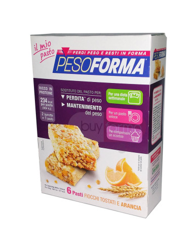 Caratteristiche Prodotto I Pasti Pesoforma si integrano perfettamente in una dieta settimanale a 1200 kcal giornaliere perché: - Sono ipocalorici: con solamente 234 kcal per pasto- Sono ricchi in proteine: le proteine contribuiscono al mantenimento della massa muscolare- Apportano tutti i nutrienti essenziali per il tuo benessere (Vitamine e minerali, proteine. carboidrati e lipidi). I Pasti Pesoforma sono un'ottima soluzione per sostituire in modo completo ed equilibrato un pasto perché: - Hanno un corretto equilibrio tra macronutrienti: proteine, carboidrati e lipidi- Contengono 12 vitamine e 11 minerali per evitare sensazioni di stanchezza o cali del rendimento Puoi portare i pasti sostitutivi sempre con te, per un pasto pratico e veloce anche fuori casa. I Pasti Pesoforma permettono di bilanciare l'apporto calorico giornaliero: - Per complensare gli eccessi del giorno prima- Per mantenersi leggeri in vista di un pasto abbondante La perdita di peso è ottenuta nell'ambito di un regime alimentare ipocalorico ed i pasti sostitutivi devono essere utilizzati necessariamente in associazione ad altri alimenti.Durante la dieta è molto importante mantenere giornalmente un adeguato apporto di liquidi (acqua, tè e tisane senza zucchero). Pesoforma Barrette Fiocchi Tostati e Arancianon contengono olio di palma.Per un pasto (62g): 984kJ / 234 kcal | Per 100g: 1587 kJ / 377 kcal Consigli d'uso Per un pasto sostitutivo occorrono due Barrette di Fiocchi Tostati e Arancia.La confezione contiene 6 Pasti Sostitutivi per un totale di 12 Barrette.