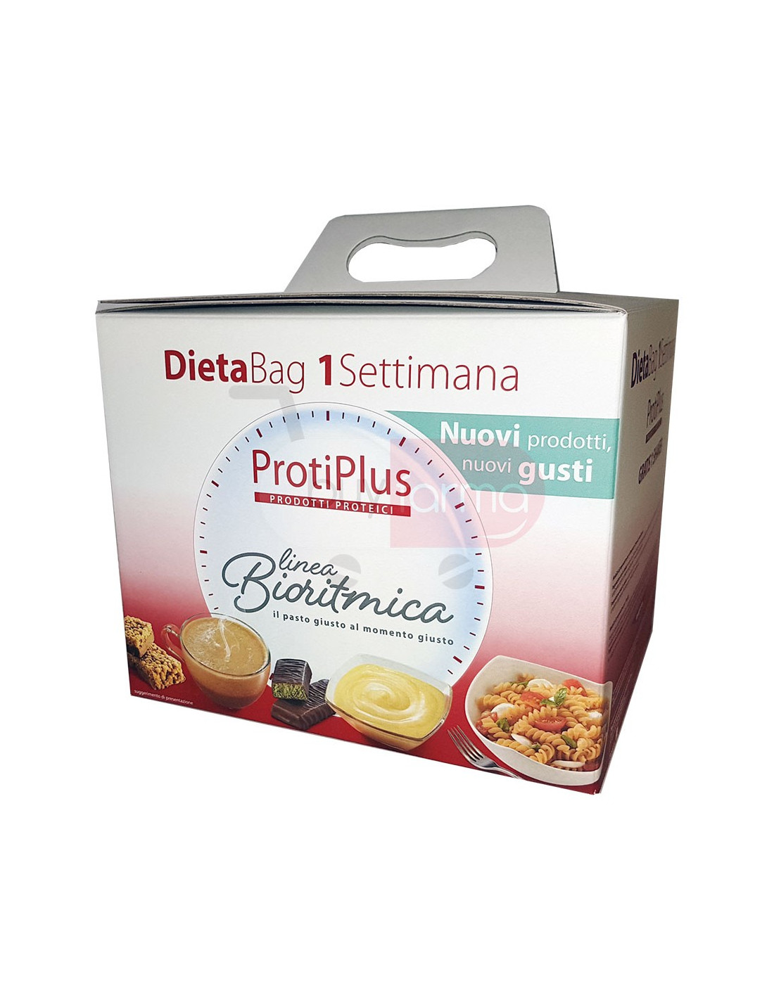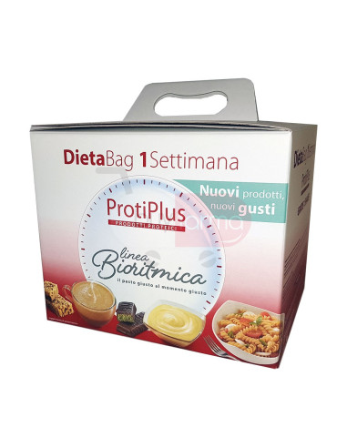 Caratteristiche Prodotto Protiplus Dieta Bag Linea Bioritmica contiene al suo interno i nuovi pasti dimagranti in barrette e in buste semplici da preparare e da consumare a colazione, a pranzo e a cena come indicato nel piano di dieta, la pasta proteica nel formato fusilli e gli snack da utilizzare nella pausa pomeridiana.Gustosi ed equilibrati i prodotti ProtiPlus ti aiuteranno a perdere i Kg di troppo senza rinunciare al gusto. Protiplus Dieta Bag contiene: 2 pasti dimagranti bevanda al cioccolato2 pasti dimagranti bevanda al cappuccino2 pasti dimagranti crema alla vaniglia1 pasto dimagrante crema alle verdure1 confezione da 250 g di fusilli (5 porzioni)4 pasti dimagranti al caffé2 pasti dimagranti al cioccolato e arachidi6 snack al cioccolato e pistacchio1 shaker in omaggio1 opuscolo informativo con il piano di dieta settimanale. Consigli d'uso La fase di dimagrimento può essere seguita per un periodo che va da 1 ad un massimo di 3 settimane consecutive. Durante questa fase i prodotti ProtiPlus vengono abbinati agli alimenti tradizionali (verdura, frutta, carne, pesce, affettati, latticini feschi e olio), seguendo il corretto ritmo della nutrizione.Scarica il Piano dieta della settimana.