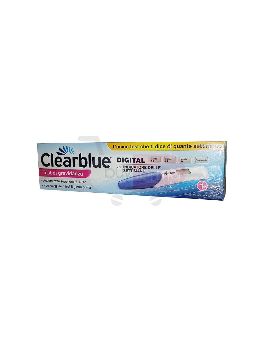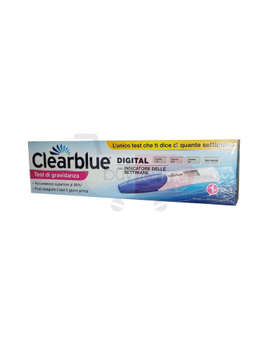 Caratteristiche Prodotto Clearblue può essere usato 5 giorni prima del ritardo del ciclo.Le settimane dal concepimento appaiono sullo schermo come 1-2, 2-3 o 3+ settimane (con accuratezza del 93%).Il medico può determinare l'inizio della gravidanza dal primo giorno dell'ultimo ciclo, non dal momento del concepimento. Consigli d'uso Tenere il puntale assorbente sotto al flusso di urina per almeno 10 secondi.Entro 3 - 5 minuti appare il risultato sul display del test di gravidanza.