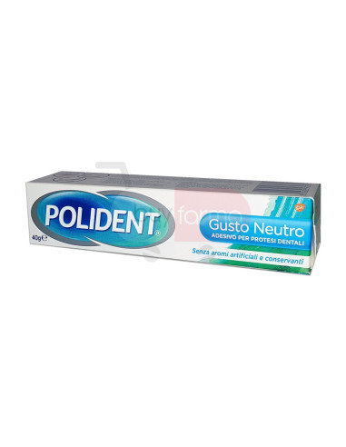 A cosa serve Polident Gusto Neutro ? Polident Gusto Neutro è privo di sapore coloranti e zinco. Le protesi dentali sono circa 10 volte meno resistenti rispetto ai denti naturali, per questo necessitano di attenzioni particolari.Usando quotidianamente Polident Pulitori e Fissativi per protesi, puoi mangiare, parlare e sorridere con fiducia. Grazie al beccuccio potrai controllare la fuoriuscita del prodotto limitando gli sprechi. Formato: 40g. Come usare Polident Gusto Neutro Applicare la crema adesiva una volta al giorno su protesi asciutta e pulita, in piccole strisce. Sciacquare la bocca, inserire la protesi, tenerla premuta in posizione e serrare i denti per qualche istante per assicurare la tenuta.Per la rimozione sciacquare la bocca con acqua calda, poi togliere lentamente la protesi.Rimuovere gli eventuali residui di crema adesiva dalla protesi e dalla bocca con acqua calda ed uno spazzolino a setole morbide.
