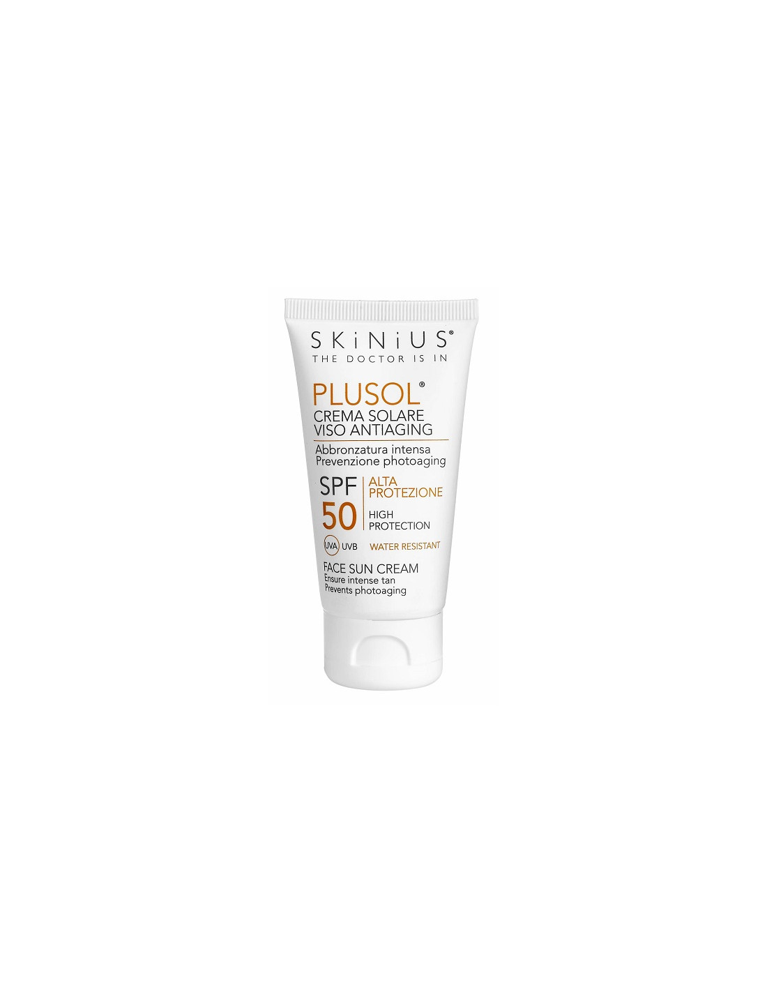 Crema solare viso SPF 50, contiene Plusolina FF, un complesso costituito da un nuovo sistema di filtri UVA e UVB, olio extravergine di oliva e vitamina E. I suoi ingredienti assicurano una efficace azione preventiva e protettiva nei confronti dei danni da esposizione solare.
