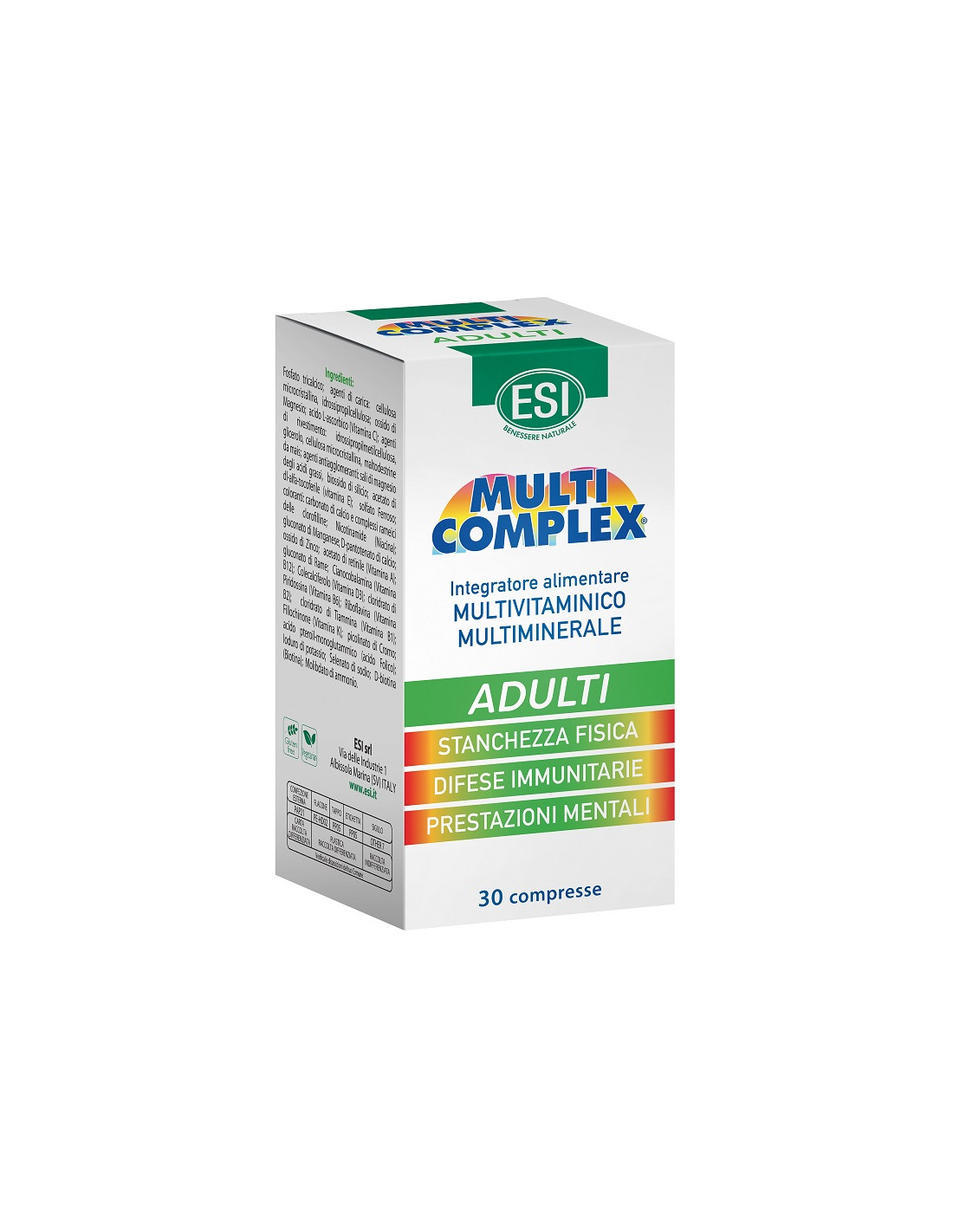 Fosfato tricalcico; agenti di carica: cellulosa microcristallina, idrossipropillcellulosa; ossido di magnesio, acido L-ascorbico (vitamina C); agenti di rivestimento: idrossipropilmetilcellulosa, glicerolo, cellulosa microcristallina, maltodestrine da mais; agenti antiagglomeranti: sali di magnesio degli acidi grassi, biossido di silicio; acetato di DL-alfa-tocoferile (vitamina E), solfato ferroso; coloranti: carbonato di calcio e complessi rameici delle clorofilline; nicotinamide (niacina), gluconato di manganese, D-pantotenato di calcio, ossido di zinco, acetato di retinile (vitamina A), gluconato di rame, cianocobalamina (vitamina B12), colecalciferolo (vitamina D3), cloridrato di piridossina (vitamina B6), riboflavina (vitamina B2), cloridrato di tiammina (vitamina B1), fillochinone (vitamina K), picolinato di cromo, acido pteroil-monoglutammico (acido folico), ioduro di potassio, selenato di sodio, D-biotina (biotina), molibdato di ammonio.