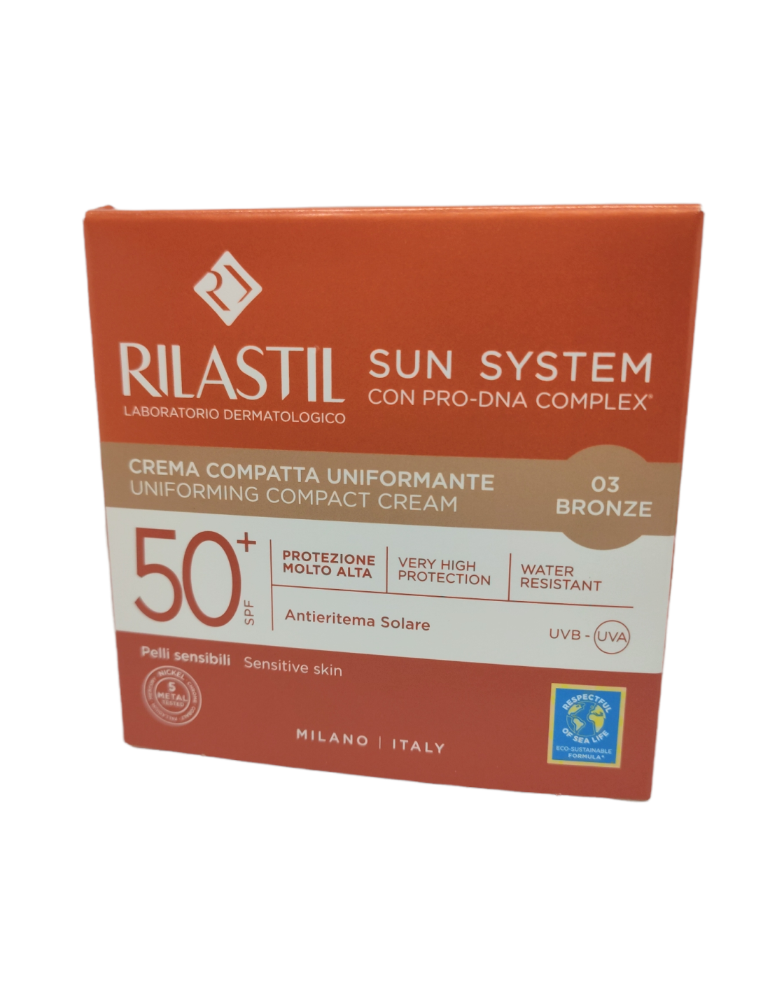 Come usare Rilastil Sun System Compatto Bronze 03 SPF 50+ ? Rilastil Sun System è la linea solare studiata per garantire a tutti i tipi di pelle, anche le più sensibili, reattive ed allergiche al sole, la sicurezza di una fotoprotezione dermatologica ad ampio spettro attraverso filtri solari di ultima generazione. La formulazione è caratterizzata dalla presenza di Pro-DNA Complex abbinata all'azione elasticizzante dovuta all'estratto di Schizandra chinensis, per una pelle sana ed elastica anche sotto il sole. Rilastil Sun System Compatto Bronze 03 SPF 50+ : Maschera le imperfezioni cutanee del viso, ad esempio, cicatrici, vitiligine, acne Garantisce una protezione molto alta ad ampio spettro dalle radiazioni UVB-UVB Previene l'insorgenza di scottature, macchie ed eritemi solari Protegge la bellezza della pelle (Pro-DNA Complex), mantenendola sana ed elastica Uniforma il colore del viso, donando un effetto "abbronzatura naturale" Ideato per: tutti i tipi di pelle (delicate e molto sensibili al sole) e garantisce fotoprotezione in caso di intenso irraggiamento solare. Formato: confezione da 10g. Componenti: Dicaprylyl Carbonate, Titanium Dioxide (Nano), Phenyl Trimethicone, Hydrogenated Polydecene, Zinc Oxide, Polyethylene, Hydrogenated Coconut Oil, Glyceryl Dibehenate, Alumina, Tribehenin, Glyceryl Behenate, Dimethicone, Silica, Bisabolol, Tocopheryl Acetate, Peucedanum ostruthium Leaf Extract, Buddlejadavidii leaf Extract, Artemisia umbelliformis Extract, Pinus pinaster Bark/Bud Extract, Lecithin, Tocopherol, Ascorbyl Palmitate, Glycerin, Diglycerin, Citric Acid, Aqua (Water), Sodium Benzoate, Potassium Sorbate. +/- Mica, CI 77492 (Iron Oxides), CI 77891 (Titanium Dioxide), CI 77491(Iron Oxides), CI 77499 (Iron Oxides). Come usare Rilastil Sun System Compatto Bronze 03 SPF 50+ Si consiglia di utilizzare l'apposita spugnetta contenuta nella confezione, applicare il prodotto almeno 30 minuti prima dell'esposizione solare, partendo dal centro del viso e sfumando il colore verso l'esterno, regolandone a piacere l'intensità.