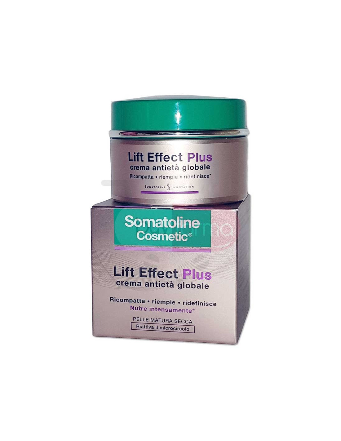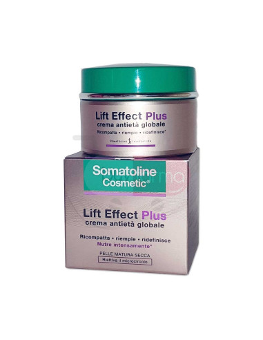 Somatoline Lift Effect Plus Crema Anti-età Pelle Secca è un trattamento che contrasta gli effetti dell'invecchiamento cutaneo ed aiuta a prolungare la vitalità cellulare. (...)Caratteristiche ProdottoLa pelle del viso è la più esposta al tempo che passa e ai cambiamenti ormonali.I segni dell'invecchiamento cutaneo si fanno più evidenti: la pelle perde tono e densità, la sua struttura si modifica a causa del rilassamento e della forza di gravità, il volto appare meno luminoso.La nuova formula concentrata in attivi ricompatta, riempie e ridefinisce la pelle.Contiene il DayRedensePlus-complex:- Peptide della giovinezza: protegge il DNA cellulare dai danni ambientali, riattivando la proteina FOXO responsabile della riparazione del danno cellulare a livello di derma e epidermide.- Biocellprotect system: stimola un'azione protettiva e rigenerativa dei tessuti cutanei, grazie all'attivazione di meccanismi foto-protettivi a livello cellulare.- Molecole attive sul microcircolo cutaneo: favoriscono l'ossigenazione e il nutrimento della pelle.- Filtro SPF10: protegge la pelle dai raggi UV e previene la formazione delle macchie cutanee.Giorno dopo giorno, la pelle del viso appare più compatta, ridensificanta, e rassodata. Visibilmente più giovane.La sua texture specifica per pelli secche è ricca di olio di Argan e Vinaccioli, dona comfort immediato e prolungato durante la giornata.Consigli d'usoSi consiglia di applicare Lift Effect Plus Crema Antietà Pelle Secca sul viso deterso ogni mattina, da solo o in combinazione con un altro trattamento della Linea Lift Effect Plus disponibile su buyfarma.it, per un'azione ancora più efficace.