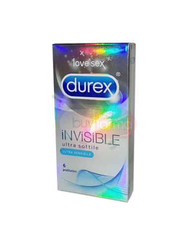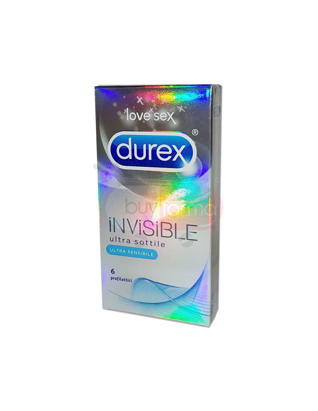 Caratteristiche Prodotto I profilattici Durex Invisible sono ultra sottili, con forma classica con serbatoio, in lattice di gomma naturale, sono trasparenti e lubrificati. Larghezza nominale 52mm. I profilattici Durex Invisible presentano una lubrificazione ottimale: infatti, il lubrificante utilizzato è privo di siliconi e polvere di talco, non unge, non appiccica, non danneggia il profilattico ed ha un odore molto gradevole grazie alla presenza di estratti naturali. Durex Invisible rispetta gli standard internazionali previsti per i profilattici e protegge da malattie sessualmente trasmissibili.
