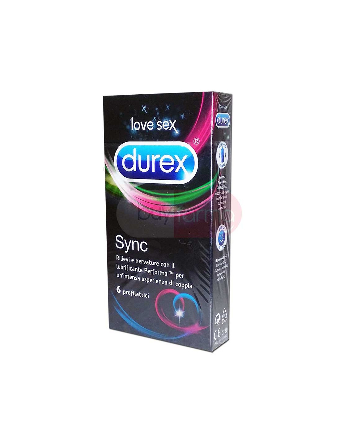 Caratteristiche Prodotto Durex Sync è un profilattico in lattice naturale con forma easy-on, contiene benzocaina al 5% nel lubrificante.Sono presenti anche nervature e rilievi extra stimolanti per favorire una migliore esperienza durante il rapporto. Indossare Durex Sync è semplicissimo: basta prendere il serbatoio tra pollice ed indice, permettendo così la fuoriuscita dell'aria, e srotolarlo per tutta la lunghezza del pene assicurandoti che il verso del profilattico sia rivolto verso l'alto. Questo preservativo stimolante e ritardante ha una larghezza nominale di 56mm ed uno spessore contenuto.