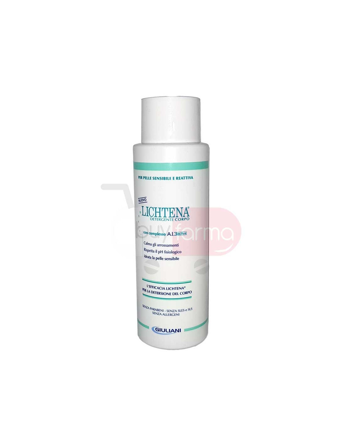 A cosa serve Lichtena Detergente Corpo A.I.3 Active ? La pelle sensibile è più reattiva a causa di una alterazione della funzione barriera cutanea.Necessita di trattamenti adeguati che ne rispettino il fragile equilibrio già a partire dalla detersione, primo gesto di cura quotidiana. Grazie ai principi attivi contenuti in Lichtena Detergente Corpo A.I.3 Active e all'esclusivo Complesso A.I.3 Active, calma gli arrossamenti e protegge la pelle sensibile.Arricchito con oli, tra cui l'olio d'oliva dalle proprietà idratanti e nutrienti, svolge un'azione emolliente e restituiva proteggendo la pelle dalla disidratazione e donandole comfort. La base detergente extra delicata, prima di SLES, SLS e Parabeni deterge nel rispetto del pH fisiologico anche dei più piccoli.Leggermente schiumogeno, Lichtena Detergente Corpo A.I.3 Active può essere utilizzato da tutti i tipi di pelle ed è indicato per tutta la famiglia. Elevata tollerabilità cutanea testata sotto controllo dermatologico. Formato: 400ml. Come usare Lichtena Detergente Corpo A.I.3 Active Si consiglia di applicare Lichtena Detergente Corpo A.I.3 Active sulla pelle umida o su una spugna, massaggiando per creare una leggera schiuma.Risciacquare e asciugare senza sfregare la pelle.