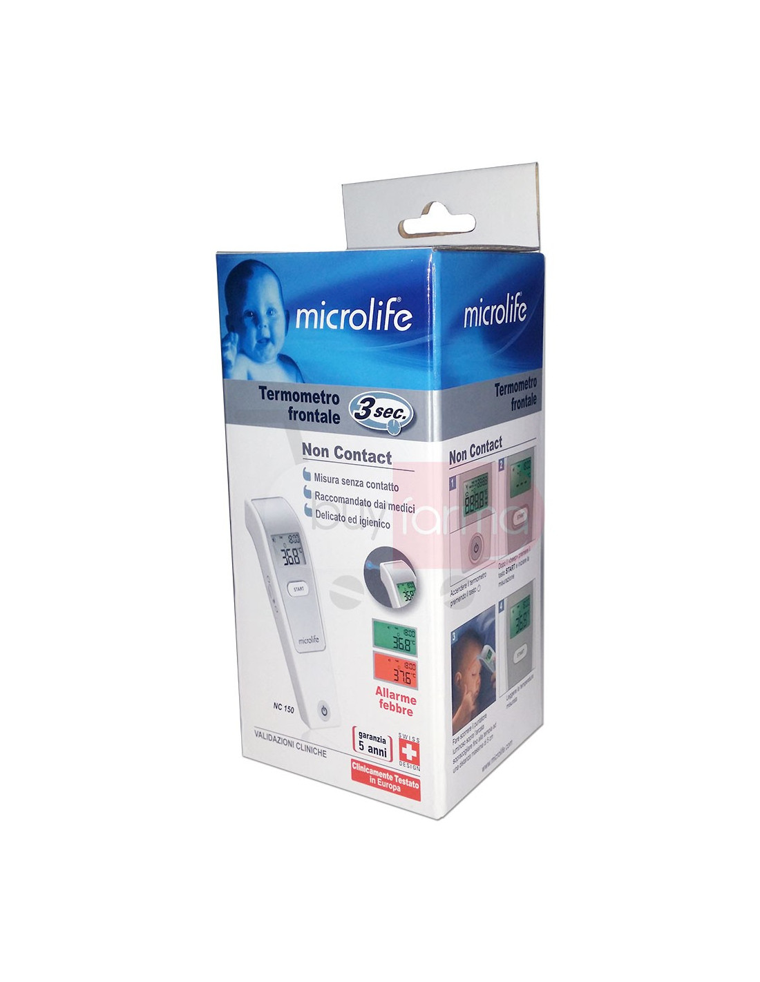 Caratteristiche Prodotto L'innovativa tecnologia ad infrarossi contenuta all'interno del termometro Microlife Non Contact permette di rilevare la temperatura senza toccare la superficie di misurazione.Questo garantisce una misurazione sicura e in condizioni igieniche sanitarie corrette in pochi secondi. Può essere utilizzato per rilevare la temperature: - del latte dei biberon- dell'acqua per il bagnetto del bambino- dell'ambiente La tecnologia costruttiva della sonda che utilizza un sensore ad infrarossi avanzato, assicura ad ogni misurazione un elevato grado di precisione ed affidabile.È possibile visualizzare le ultime 30 misurazioni con ora e data entrando nella funzione di richiamo delle memorie e consentendo all'utente una chiara panoramica sulle variazioni della temperatura.È in grado di emettere fino a 10 brevi segnali acustici (beep) ed il display retroilluminato di colore rosso avvisa il paziente che la temperatura misurata è uguale o maggiore di 37,5 °C. Contenuto MIcrolife Ear NC 150 è pronto all'uso con i seguenti accessori in dotazione: • Custodia • Batteria • Manuale d'istruzioni Prodotto detraibile