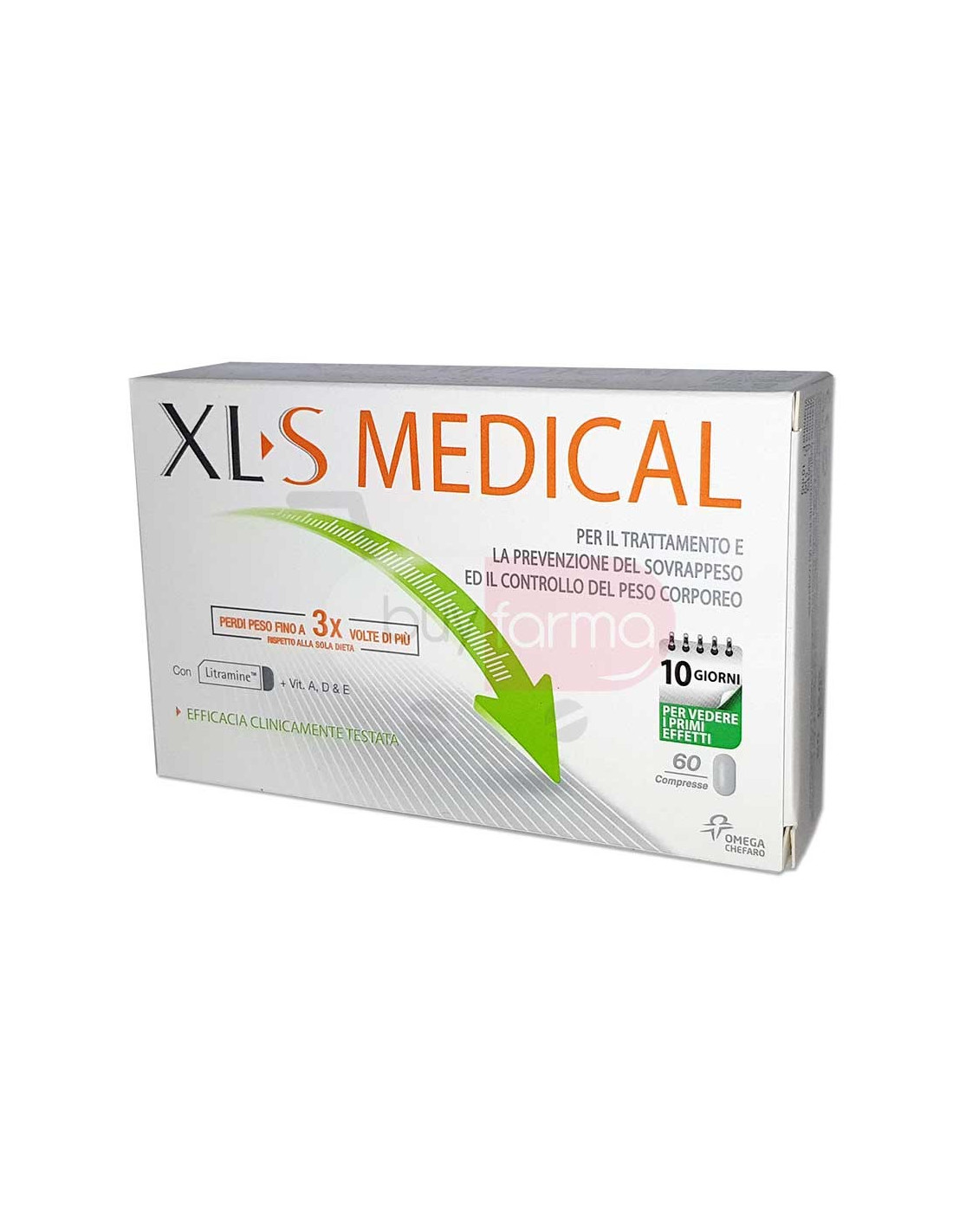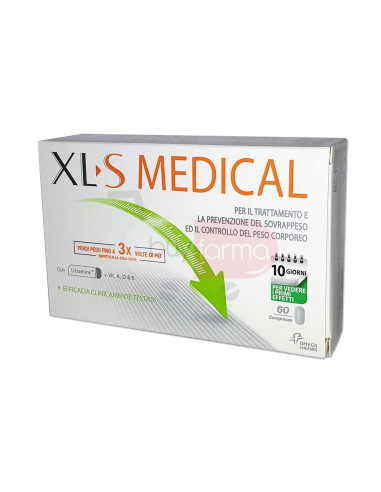 Caratteristiche Prodotto XLS Medical Liposinol contiene Litramine, un complesso brevettato di fibre clinicamente testato, di origine naturale ed organica che si lega ai grassi alimentari.XLS Medical aiuta a perdere peso fino a 3 volte di più rispetto alla sola dieta: - Cattura fino al 28% dei grassi ingeriti- Riduce l'appetito e il desiderio di cibo È un dispositivo medico efficace per il controllo del peso, se abbinato ad un regime dietetico ipocalorico e ad un attività fisica adeguata.XLS Medical ha caratteristiche di sicurezza e tollerabilità certificate.Senza aggiunta di coloranti artificiali, aromi, sale e conservanti. La confezione da 60 compresse offre 10 giorni di trattamento.Dopo 10 giorni, si potranno notare i primi benefici: provare un senso si sazietà, avere meno appetito e desiderio di cibo, rispettando l'organismo.Per raggiungere gli obiettivi di perdita di peso raccomandiamo di utilizzare XLS Medical per almeno 1 mese o più. Consigli d'uso Si consiglia di assumere 2 compresse 3 volte al giorno, immediatamente dopo i pasti.Se si salta un pasto, prendere comunque 2 compresse.Non superare le 6 compresse al giorno.