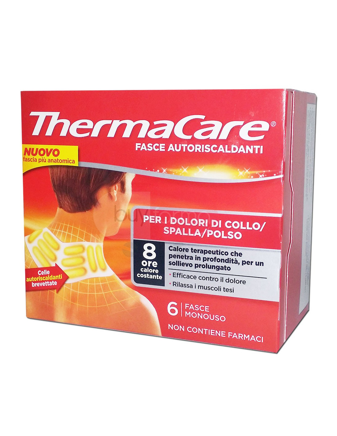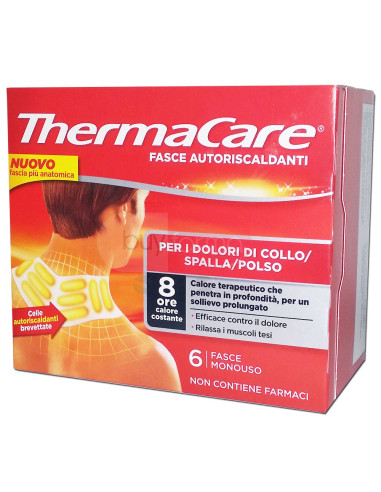Caratteristiche Prodotto Le fasce autoriscaldanti ThermaCare sono soffici e confortevoli, con speciali celle brevettate che contengono ingredienti naturali come ferro, carbone, sale ed acqua, che al contatto con l'ossigeno sviluppano calore.ThermaCare produce effetti antidolorifici e rilassanti per la muscolatura, in quanto porta più ossigeno ai tessuti danneggiati, aiutando il muscolo a ritornare allo stato di benessere.Inoltre, stimola le terminazioni nervose, interrompendo la trasmissione del dolore e favorendo quindi il rilassamento muscolare. ThermaCare è efficace e mirato contro i dolori muscolari e delle articolazioni dovuti a: - Affaticamento e tensione muscolare; - Distorsioni, stiramenti; - Artrite; Adatto per dolori cronici e occasionali. Consigli d'uso Aprire l'involucro quando si è pronti all'uso, rimuovere la carta protettiva per scoprire la parte adesiva e posizionare sull'area dolente con la parte più scura delle celle rivolta verso la pelle e premere con decisione la linguetta adesiva sulla pelle.Per una massima efficacia, vi raccomandiamo di indossare ThermaCare per 8 ore.