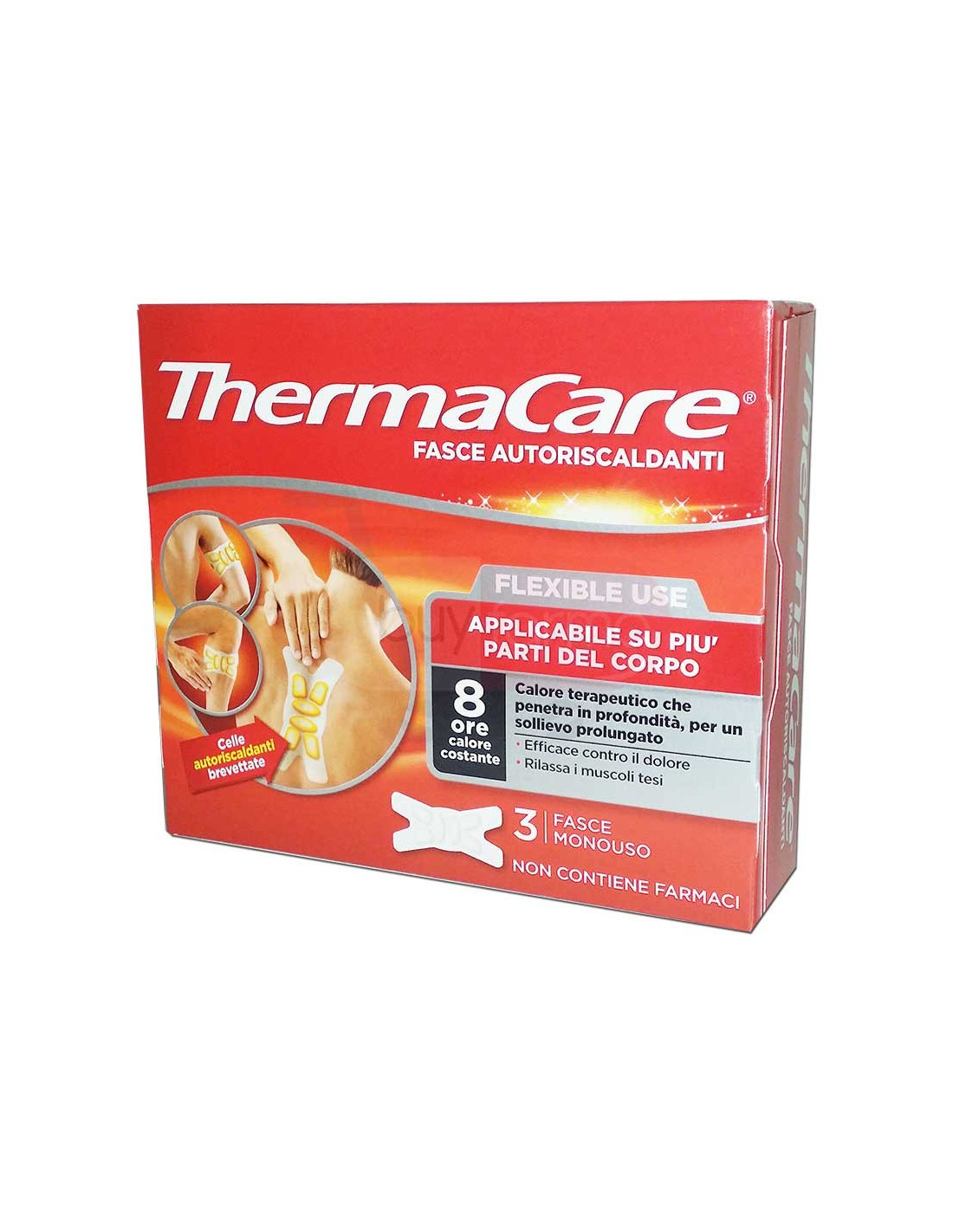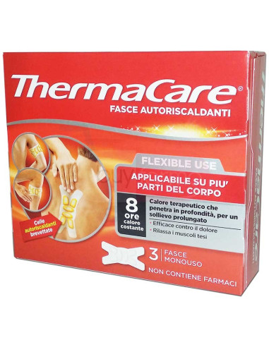 Caratteristiche Prodotto Le fasce autoriscaldanti ThermaCare sono soffici e confortevoli, con speciali celle brevettate che contengono ingredienti naturali come ferro, carbone, sale ed acqua, che al contatto con l'ossigeno sviluppano calore.ThermaCare produce effetti antidolorifici e rilassanti per la muscolatura, in quanto porta più ossigeno ai tessuti danneggiati, aiutando il muscolo a ritornare allo stato di benessere.Inoltre, stimola le terminazioni nervose, interrompendo la trasmissione del dolore e favorendo quindi il rilassamento muscolare. ThermaCare è efficace e mirato contro i dolori muscolari e delle articolazioni dovuti a: - Affaticamento e tensione muscolare; - Distorsioni, stiramenti; - Artrite; Adatto per dolori cronici e occasionali. Consigli d'uso Aprire l'involucro quando si è pronti all'uso, rimuovere la carta protettiva per scoprire la parte adesiva e posizionare sull'area dolente con la parte più scura delle celle rivolta verso la pelle e premere con decisione la linguetta adesiva sulla pelle.Per una massima efficacia, vi raccomandiamo di indossare ThermaCare per 8 ore.