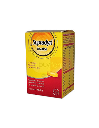 A cosa serve Supradyn Ricarica ? Supradyn Ricarica contiene Vitamina B1, Vitamina B2, Vitamina B5 e Niacina ad alto dosaggio.In quantità pari al 300% del valore Nutritivo di Riferimento. I suoi componenti sono descritti come segue: Vitamine del gruppo B, Rame, Ferro, Iodio, che contribuiscono al normale metabolismo energetico favorendo la trasformazione del cibo in Energia. Vitamina A, Vitamina D e Vitamina C che contribuiscono alla normale funzione del sistema immunitario. Vitamina E, Vitamina C, Selenio e Zinco che contribuiscono alla protezione delle cellule dallo stress ossidativo. Le compresse rivestite di Supradyn Ricarica hanno un basso contenuto di zuccheri e di sale. Formato: 35 compresse rivestite. Come usare Supradyn Ricarica Si consiglia l'assunzione di 1 compressa per adulti e bambini da 12 anni in su.La compressa va sciolta in un bicchiere d'acqua (circa 200ml).