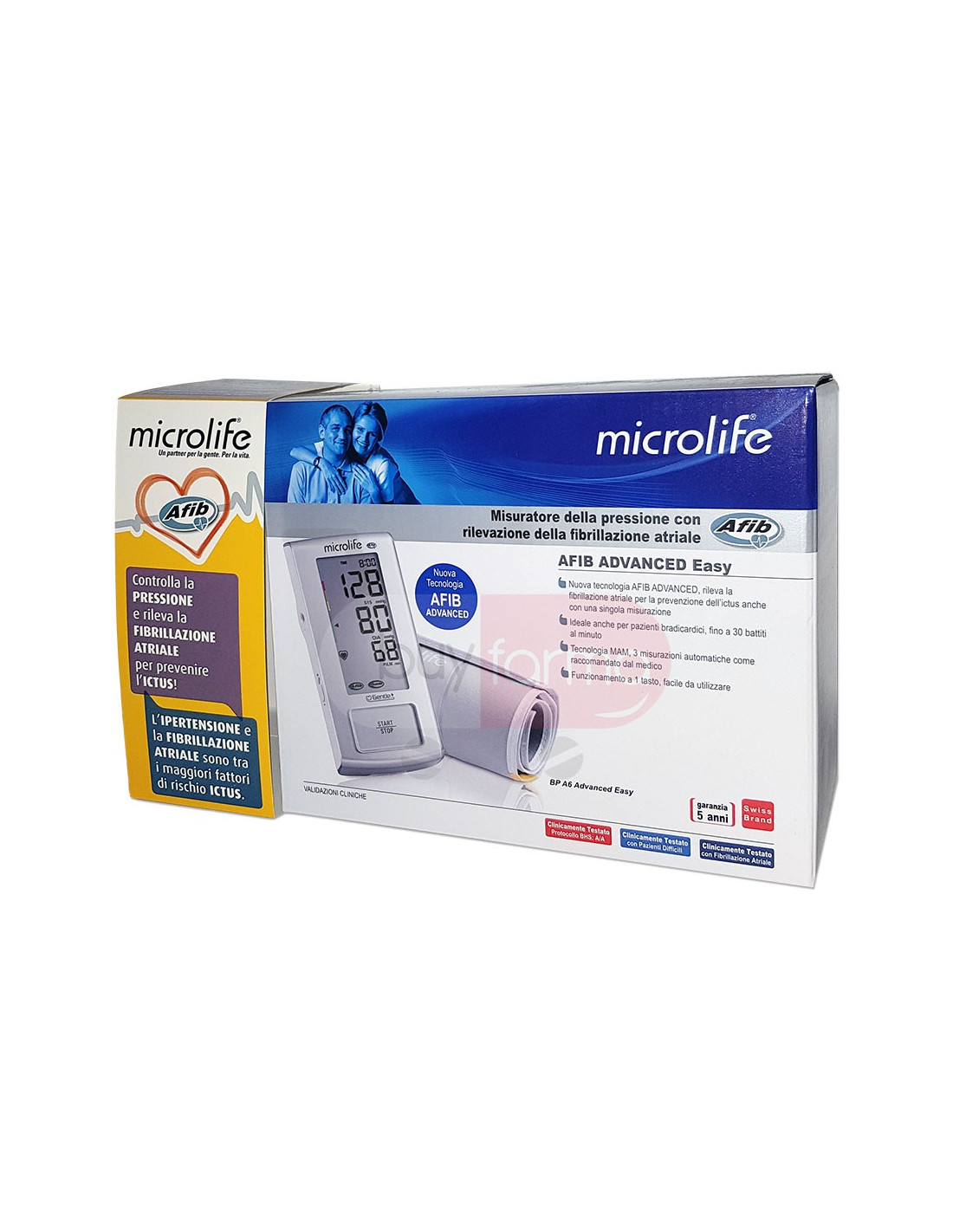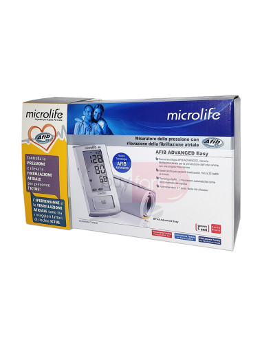 Microlife AFIB Advanced Easy Misuratore di Pressione da Braccio BP A6 con la nuova tecnologia AFIB ADVANCED per la rilevazione della fibrillazione atriale, in grado di rilevare anche il battito cardiaco. Prodotto garantito 5 anni. (...)Caratteristiche ProdottoIl misuratore di pressione Microlife AFIB Advanced Easy grazie alla tecnologia AFIB ADVANCED, rileva la fibrillazione atriale per la prevenzione dell'ictus anche con una singola misurazione.La tecnologia MAM effettua 3 misurazioni automatiche come raccomandato dal medico.Microlife AFIB Advaced Easy è dotato di tecnologia Gentle+ che assicura una misurazione più confortevole con un gonfiaggio più delicato. Un sistema integrato per il controllo ottimale della pressione nel bracciale riduce la costrizione del braccio.Il bracciale universale incluso nella confezione, dona aderenza e comfort.ContenutoMicrolife AFIB Advanced Easy è pronto per l'utilizzo grazie agli accessori inclusi nella confezione: • Bracciale 22-42 cm • Batterie AA • Comoda borsa per il trasporto • Manuale d'istruzioneProdotto detraibile