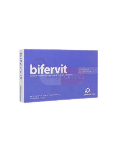 Bifervit è un Integratore Alimentare a base di ferro, acido folico, vitamina C e vitamina B12, utile a colmare gli aumentati fabbisogni di tali nutrienti. (...)Caratteristiche ProdottoIl ferro è essenziale per la produzione dei globuli rossi e spesso deve essere supplementato per evitare il rischio di anemie. L’acido folico è un componente essenziale degli eritrociti ed un fattore chiave della sintesi dei globuli rossi. Un apporto ottimale di acido folico valorizza appieno l’apporto del ferro, ne migliora l’assorbimento e lo rende maggiormente “biodisponibile”, facilitandone un ottimale utilizzo nel processo di produzione dei globuli rossi.La vitamina B12 è un altro elemento critico della sintesi eritrocitaria e una componente strutturale del sito di legame al Ferro presente in ogni globulo rosso.La vitamina C, presente in quantità biologicamente attive, ha un’azione antiossidante e rende più efficace l’assorbimento gastrico del ferro.Consigli d'usoSi consiglia di assumere una o più compresse al giorno, secondo il giudizio medico.Da assumere a stomaco pieno.