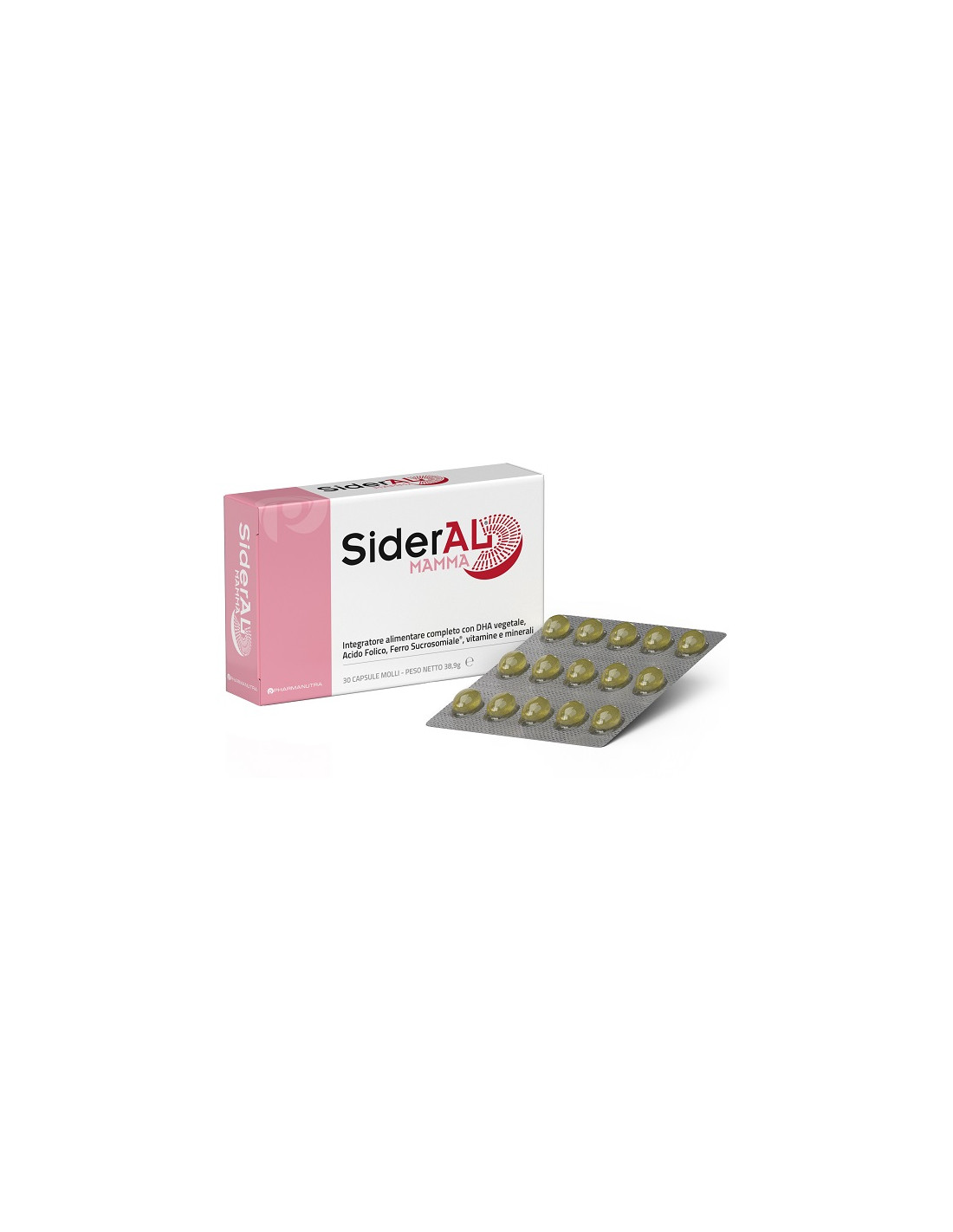 Olio ricco in DHA derivato dalla microalga Schizochytrium sp., gelatina alimentare, olio di girasole, Sideral r.m-ferro sucrosomiale (ferro pirofosfato, esteri saccarici degli acidi grassi, lecitina di girasole, amido di riso pregelatinizzato); agente di resistenza: glicerolo; vitamina C (acido ascorbico); emulsionante: lecitina di girasole; addensante: mono e di gliceridi degli acidi grassi; Ultraiod-iodio sucrosomiale (amido di riso pregelatinizzato, esteri saccaridi degli acidi grassi, sodio iodato, lecitina di girasole), nicotinamide (niacina), ossido di zinco, betavarotene al 30% in olio di girasole, vitamina E naturale (D-alfa-tocoferolo in olio di girasole), UltraD3 - vitamina D3 sucrosomiale (colecalciferolo, alfa-tocoferolo, ascorbato di sodio, biossido di silicio, ottenilsuccinato di amido e sodio, trigliceridi a media catena, esteri saccarici degli acidi grassi, amido di riso pregelatinizzato, lecitina di girasole), vitamina B5 (calcio D-pantotenato), monofluorofosfato di sodio; coloranti: ossidi di ferro, vitamina B12 0,1% (cianocobalamina su maltodestrine da mais), vitamina B6 (piridossina cloridrato), solfato di rame, vitamina B1 (tiamina mononitrato), vitamina B2 (riboflavina), acido folico (acido pteroil-monoglutammico), biotina, sodio selenito, vitamina K1 (fitomenadione).