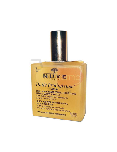 Caratteristiche Prodotto Nuxe Huile Prodigieuse Riche con un unico gesto, nutre intensamente viso, corpo e capelli, ripara e ammorbidisce. Inoltre ha un potere antiossidante e capacità di ridurre le smagliature. Formula : Principali principi attivi di origine naturale, Olio di Tsubaki, Olio di Mandorla dolce, Olio di Camelia, Olio di Borragine, Olio di Nocciola, Olio di Macadamia, Olio di Argan.Una texture ricca ultra sensoriale non grassa e non appiccicosa.Contiene il 98,1 % di ingredienti di origine naturale. Senza olio minerale.Senza Silicone. Su buyfarma.it è disponibile anche il formato più piccolo, da 50ml. Nuxe Huile Prodigieuse Inci : CAPRYLIC/CAPRIC TRIGLYCERIDE, MACADAMIA INTEGRIFOLIA SEED OIL, DECYL OLEATE, OLEIC/LINOLEIC/LINOLENIC POLYGLYCERIDES, PRUNUS AMYGDALUS DULCIS (SWEET ALMOND) OIL, CORYLUS AVELLANA (HAZEL) SEED OIL, CAMELLIA OLEIFERA SEED OIL, PARFUM/FRAGRANCE, CAMELLIA JAPONICA SEED OIL, TOCOPHEROL, ARGANIA SPINOSA KERNEL OIL, BORAGO OFFICINALIS SEED OIL, TOCOPHERYL ACETATE, HELIANTHUS ANNUUS (SUNFLOWER) SEED OIL, ROSMARINUS OFFICINALIS (ROSEMARY) LEAF EXTRACT, POLYGLYCERYL-3 DIISOSTEARATE, ASCORBIC ACID, SOLANUM LYCOPERSICUM (TOMATO) FRUIT EXTRACT, BENZYL SALICYLATE, LINALOOL, LIMONENE, CITRONELLOL, GERANIOL [N2214/A]. L'elenco degli ingredienti può subire delle variazioni, vi consigliamo di verificare sempre la lista presente sul prodotto acquistato. Consigli d'uso Viso : Si consiglia di applicare l'olio ricco per pelle secca una volta al giorno con movimenti dal centro verso l’ovale del viso. Corpo : Applica l’olio ricco e massaggia la pelle con movimenti circolari insistendo sulle zone molto secche. Capelli : Sui capelli secchi, spruzza qualche goccia sul palmo della mano e applicalo al bisogno sulle lunghezze e sulle punte.