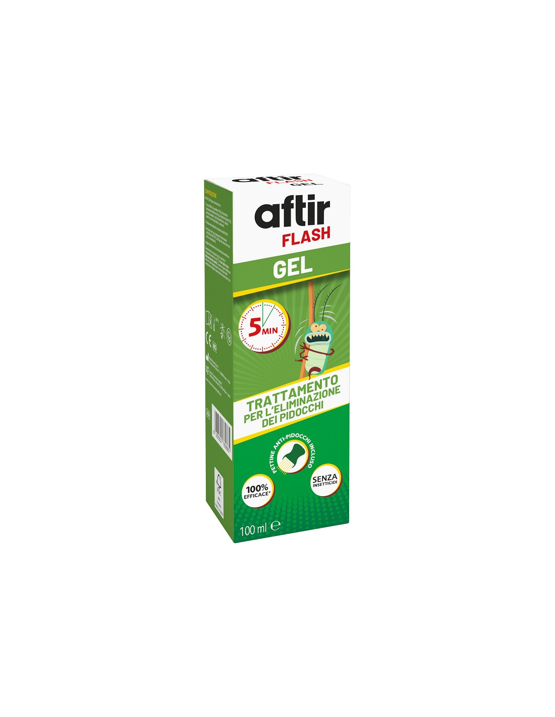 Trattamento per l'eliminazione di pidocchi del capo e lendini. AFTIR FLASH gel uccide i pidocchi mediante un meccanismo d'azione fisico (soffocamento) e impedisce lo sviluppo delle lendini (uova di pidocchio).